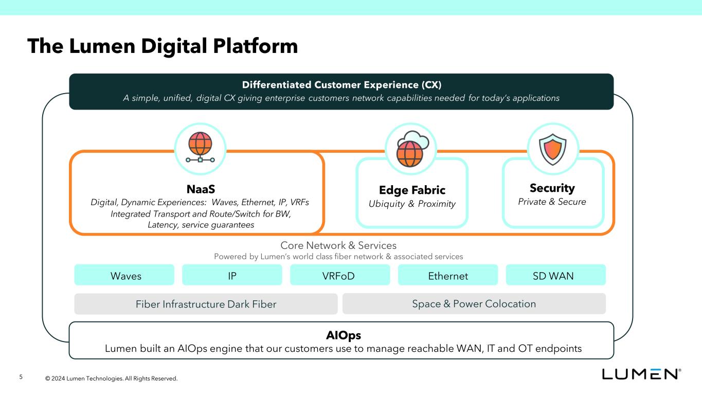 © 2024 Lumen Technologies. All Rights Reserved. 4 Slide Title Disrupting Traditional Telecom & Powering the Digital Economy Executing Lumen's Transformation Innovating for Growth Cloudifying telecom and empowering Customers to Unleash the World’s Digital Potential Driving Commercial Excellence Securing the Base by Improving Sales Execution, Enhancing the Customer Experience & Reducing Churn Improving Financial Health Announced over $5B in PCF sales and targeting over $1B in cost efficiencies
