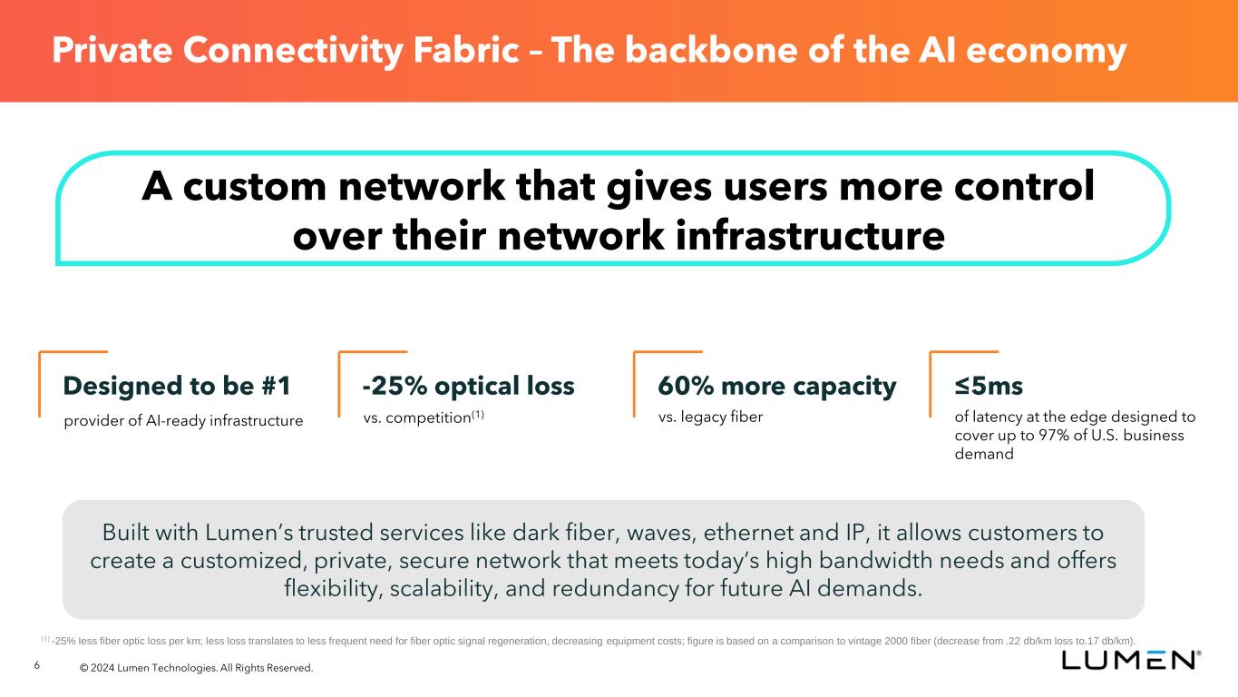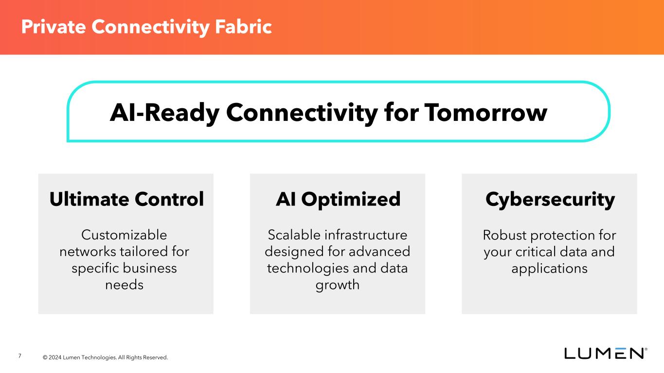 © 2024 Lumen Technologies. All Rights Reserved. 6 Private Connectivity Fabric – The backbone of the AI economy A custom network that gives users more control over their network infrastructure Designed to be #1 provider of AI-ready infrastructure -25% optical loss vs. competition(1) 60% more capacity vs. legacy fiber ≤5ms of latency at the edge designed to cover up to 97% of U.S. business demand Built with Lumen’s trusted services like dark fiber, waves, ethernet and IP, it allows customers to create a customized, private, secure network that meets today’s high bandwidth needs and offers flexibility, scalability, and redundancy for future AI demands. (1) -25% less fiber optic loss per km; less loss translates to less frequent need for fiber optic signal regeneration, decreasing equipment costs; figure is based on a comparison to vintage 2000 fiber (decrease from .22 db/km loss to.17 db/km).