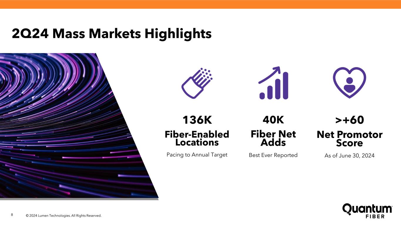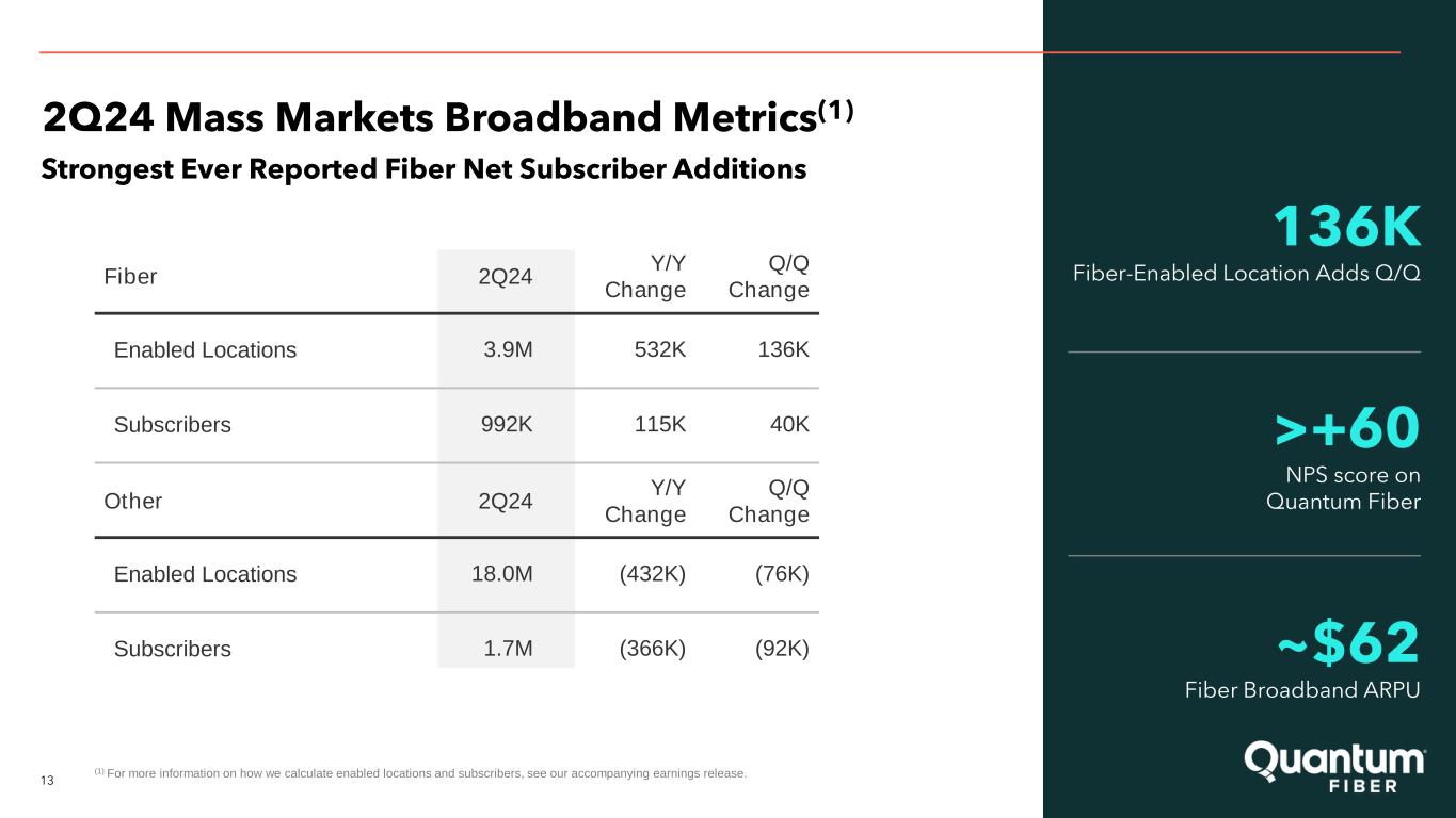 2Q24 Mass Markets Broadband Metrics(1) 136K Fiber-Enabled Location Adds Q/Q >+60 NPS score on Quantum Fiber ~$62 Fiber Broadband ARPU (1) For more information on how we calculate enabled locations and subscribers, see our accompanying earnings release. Strongest Ever Reported Fiber Net Subscriber Additions Fiber 2Q24 Y/Y Change Q/Q Change Enabled Locations 3.9M 532K 136K Subscribers 992K 115K 40K Other 2Q24 Y/Y Change Q/Q Change Enabled Locations 18.0M (432K) (76K) Subscribers 1.7M (366K) (92K) 13