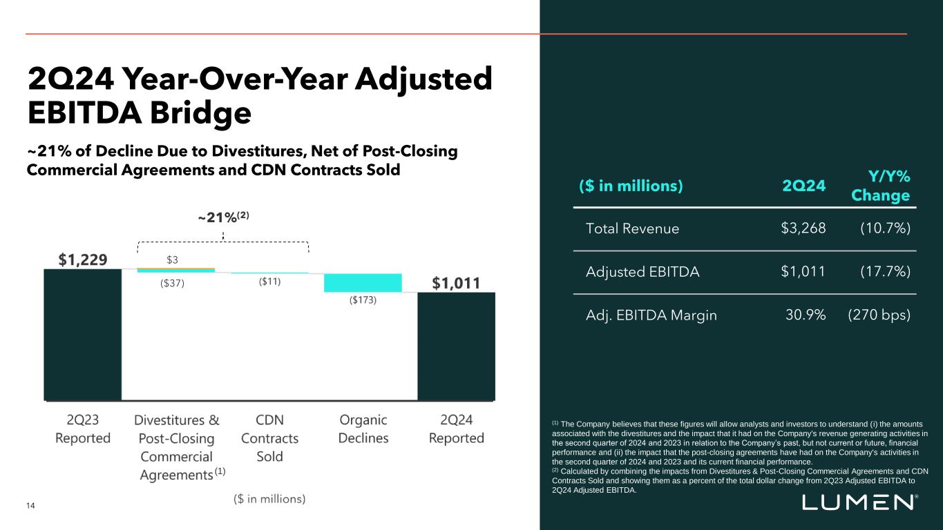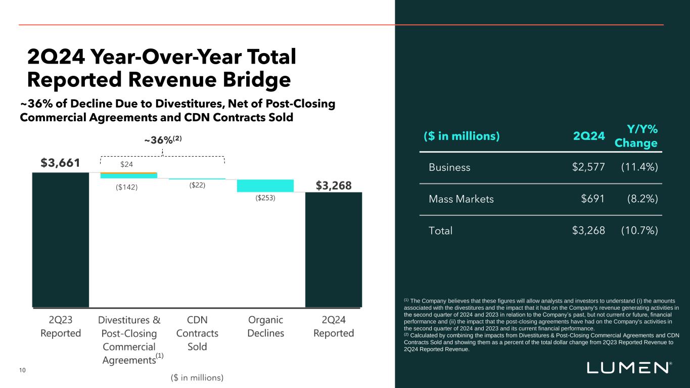 2Q24 Year-Over-Year Total Reported Revenue Bridge ~36% of Decline Due to Divestitures, Net of Post-Closing Commercial Agreements and CDN Contracts Sold (1) The Company believes that these figures will allow analysts and investors to understand (i) the amounts associated with the divestitures and the impact that it had on the Company's revenue generating activities in the second quarter of 2024 and 2023 in relation to the Company’s past, but not current or future, financial performance and (ii) the impact that the post-closing agreements have had on the Company's activities in the second quarter of 2024 and 2023 and its current financial performance. (2) Calculated by combining the impacts from Divestitures & Post-Closing Commercial Agreements and CDN Contracts Sold and showing them as a percent of the total dollar change from 2Q23 Reported Revenue to 2Q24 Reported Revenue. ($ in millions) 2Q24 Y/Y% Change Business $2,577 (11.4%) Mass Markets $691 (8.2%) Total $3,268 (10.7%) $24 (1) ($142) ~36%(2) $3,661 10