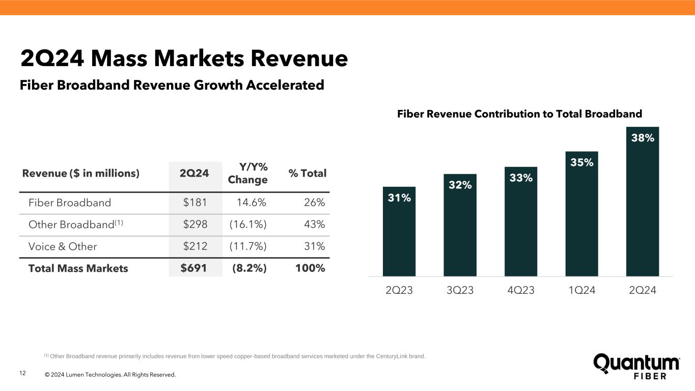 © 2024 Lumen Technologies. All Rights Reserved. 11 ($ in millions) 2Q24 Y/Y% Change Q/Q% Change % Total Grow $761 1.5% 0.3% 43% Nurture $524 (12.1%) (3.5%) 30% Harvest $286 (10.6%) (3.4%) 16% Subtotal $1,571 (5.7%) (1.7%) 89% Other(3) $192 18.5% 15.7% 11% N.A. Enterprise $1,763 (3.6%) (0.1%) 100% ($ in millions) 2Q24 Y/Y% Change Q/Q% Change Large Enterprise $837 (6.9%) (2.4%) Mid-Market Enterprise $478 (7.0%) (1.6%) Public Sector $448 8.0% 6.7% N.A. Enterprise $1,763 (3.6%) (0.1%) Wholesale(1) $723 (10.0%) (1.0%) N.A. Total Business(1) $2,486 (5.5%) (0.3%) International & Other(1)(2) $91 (67.1%) (6.2%) Total Business(1)(2) $2,577 (11.4%) (0.5%) Total Mass Markets $691 (8.2%) (1.1%) Total Revenue(1)(2) $3,268 (10.7%) (0.7%) 2Q24 Total Reported Revenue (1) 2Q23 results include revenue from Lumen's EMEA business, which was sold November 1, 2023. Please see Lumen’s accompanying Financial Trending Schedule for impacts from post-closing commercial agreements and divestitures. (2) International & Other includes all Content Deliver Network “CDN” revenue. 2Q23 results include revenue from select CDN customer contracts which were sold as announced on October 10, 2023. (3) Other revenue includes Equipment and Managed & Professional Services. Maintained Growth in N.A. Enterprise Grow Products