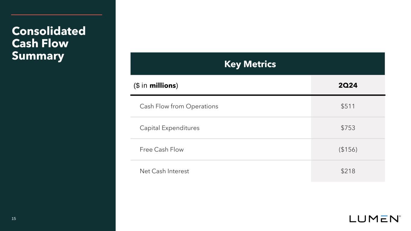 ~21%(2) 2Q24 Year-Over-Year Adjusted EBITDA Bridge ~21% of Decline Due to Divestitures, Net of Post-Closing Commercial Agreements and CDN Contracts Sold (1) ($37) (1) The Company believes that these figures will allow analysts and investors to understand (i) the amounts associated with the divestitures and the impact that it had on the Company's revenue generating activities in the second quarter of 2024 and 2023 in relation to the Company’s past, but not current or future, financial performance and (ii) the impact that the post-closing agreements have had on the Company's activities in the second quarter of 2024 and 2023 and its current financial performance. (2) Calculated by combining the impacts from Divestitures & Post-Closing Commercial Agreements and CDN Contracts Sold and showing them as a percent of the total dollar change from 2Q23 Adjusted EBITDA to 2Q24 Adjusted EBITDA. ($ in millions) 2Q24 Y/Y% Change Total Revenue $3,268 (10.7%) Adjusted EBITDA $1,011 (17.7%) Adj. EBITDA Margin 30.9% (270 bps) 14 $3