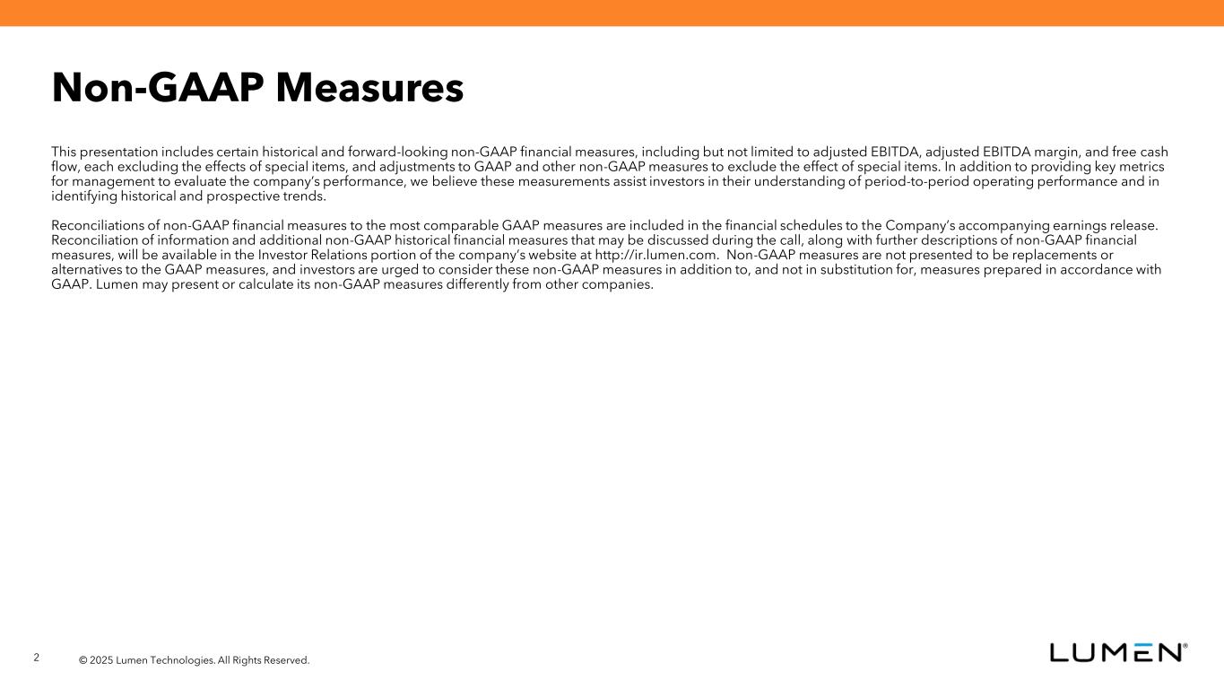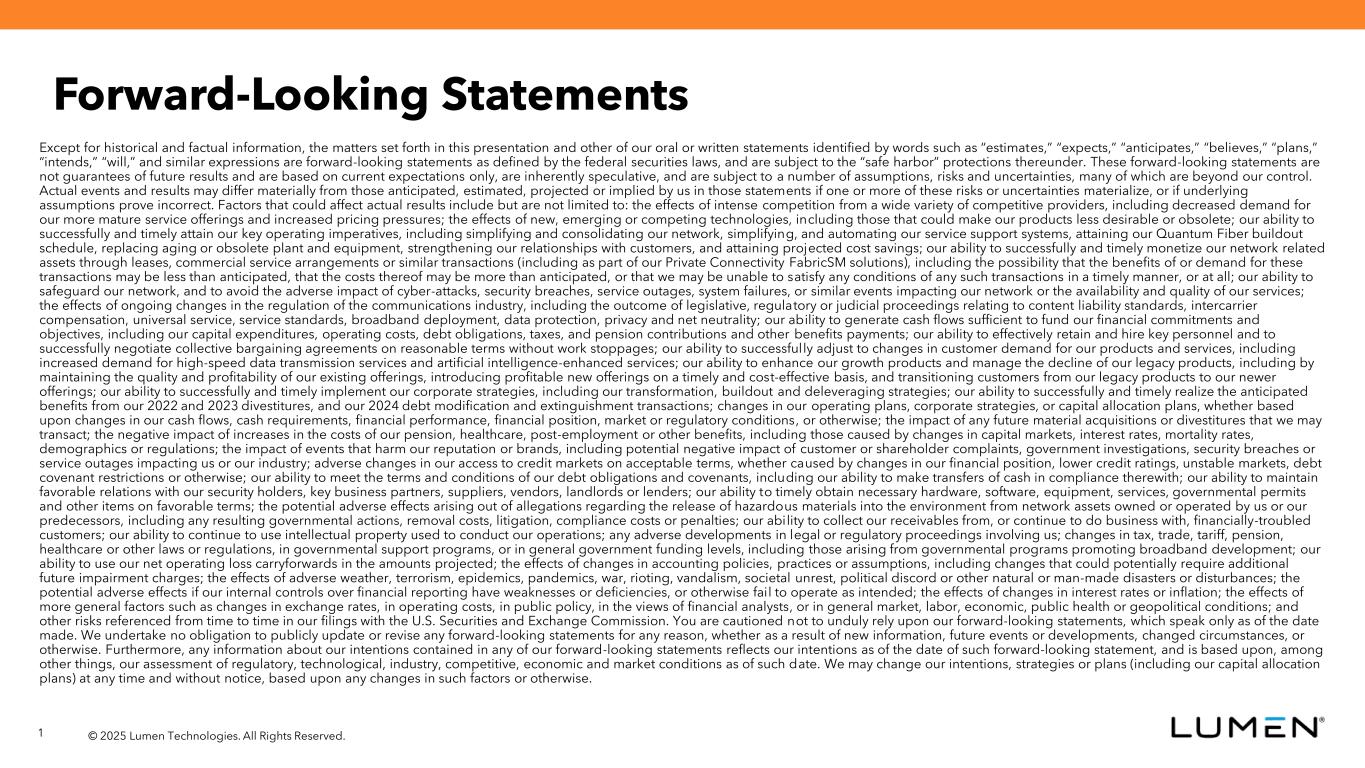 © 2025 Lumen Technologies. All Rights Reserved. 1 Forward-Looking Statements Except for historical and factual information, the matters set forth in this presentation and other of our oral or written statements identified by words such as “estimates,” “expects,” “anticipates,” “believes,” “plans,” “intends,” “will,” and similar expressions are forward-looking statements as defined by the federal securities laws, and are subject to the “safe harbor” protections thereunder. These forward-looking statements are not guarantees of future results and are based on current expectations only, are inherently speculative, and are subject to a number of assumptions, risks and uncertainties, many of which are beyond our control. Actual events and results may differ materially from those anticipated, estimated, projected or implied by us in those statements if one or more of these risks or uncertainties materialize, or if underlying assumptions prove incorrect. Factors that could affect actual results include but are not limited to: the effects of intense competition from a wide variety of competitive providers, including decreased demand for our more mature service offerings and increased pricing pressures; the effects of new, emerging or competing technologies, including those that could make our products less desirable or obsolete; our ability to successfully and timely attain our key operating imperatives, including simplifying and consolidating our network, simplifying, and automating our service support systems, attaining our Quantum Fiber buildout schedule, replacing aging or obsolete plant and equipment, strengthening our relationships with customers, and attaining projected cost savings; our ability to successfully and timely monetize our network related assets through leases, commercial service arrangements or similar transactions (including as part of our Private Connectivity FabricSM solutions), including the possibility that the benefits of or demand for these transactions may be less than anticipated, that the costs thereof may be more than anticipated, or that we may be unable to satisfy any conditions of any such transactions in a timely manner, or at all; our ability to safeguard our network, and to avoid the adverse impact of cyber-attacks, security breaches, service outages, system failures, or similar events impacting our network or the availability and quality of our services; the effects of ongoing changes in the regulation of the communications industry, including the outcome of legislative, regulatory or judicial proceedings relating to content liability standards, intercarrier compensation, universal service, service standards, broadband deployment, data protection, privacy and net neutrality; our ability to generate cash flows sufficient to fund our financial commitments and objectives, including our capital expenditures, operating costs, debt obligations, taxes, and pension contributions and other benefits payments; our ability to effectively retain and hire key personnel and to successfully negotiate collective bargaining agreements on reasonable terms without work stoppages; our ability to successfully adjust to changes in customer demand for our products and services, including increased demand for high-speed data transmission services and artificial intelligence-enhanced services; our ability to enhance our growth products and manage the decline of our legacy products, including by maintaining the quality and profitability of our existing offerings, introducing profitable new offerings on a timely and cost-effective basis, and transitioning customers from our legacy products to our newer offerings; our ability to successfully and timely implement our corporate strategies, including our transformation, buildout and deleveraging strategies; our ability to successfully and timely realize the anticipated benefits from our 2022 and 2023 divestitures, and our 2024 debt modification and extinguishment transactions; changes in our operating plans, corporate strategies, or capital allocation plans, whether based upon changes in our cash flows, cash requirements, financial performance, financial position, market or regulatory conditions, or otherwise; the impact of any future material acquisitions or divestitures that we may transact; the negative impact of increases in the costs of our pension, healthcare, post-employment or other benefits, including those caused by changes in capital markets, interest rates, mortality rates, demographics or regulations; the impact of events that harm our reputation or brands, including potential negative impact of customer or shareholder complaints, government investigations, security breaches or service outages impacting us or our industry; adverse changes in our access to credit markets on acceptable terms, whether caused by changes in our financial position, lower credit ratings, unstable markets, debt covenant restrictions or otherwise; our ability to meet the terms and conditions of our debt obligations and covenants, including our ability to make transfers of cash in compliance therewith; our ability to maintain favorable relations with our security holders, key business partners, suppliers, vendors, landlords or lenders; our ability to timely obtain necessary hardware, software, equipment, services, governmental permits and other items on favorable terms; the potential adverse effects arising out of allegations regarding the release of hazardous materials into the environment from network assets owned or operated by us or our predecessors, including any resulting governmental actions, removal costs, litigation, compliance costs or penalties; our ability to collect our receivables from, or continue to do business with, financially-troubled customers; our ability to continue to use intellectual property used to conduct our operations; any adverse developments in legal or regulatory proceedings involving us; 