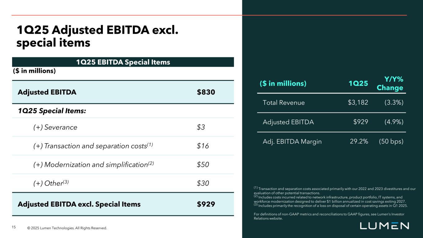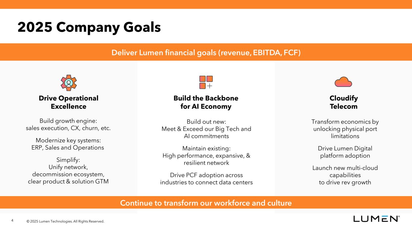 © 2025 Lumen Technologies. All Rights Reserved. 2 Non-GAAP Measures This presentation includes certain historical and forward-looking non-GAAP financial measures, including but not limited to adjusted EBITDA, adjusted EBITDA margin, and free cash flow, each excluding the effects of special items, and adjustments to GAAP and other non-GAAP measures to exclude the effect of special items. In addition to providing key metrics for management to evaluate the company’s performance, we believe these measurements assist investors in their understanding of period-to-period operating performance and in identifying historical and prospective trends. Reconciliations of non-GAAP financial measures to the most comparable GAAP measures are included in the financial schedules to the Company’s accompanying earnings release. Reconciliation of information and additional non-GAAP historical financial measures that may be discussed during the call, along with further descriptions of non-GAAP financial measures, will be available in the Investor Relations portion of the company’s website at http://ir.lumen.com. Non-GAAP measures are not presented to be replacements or alternatives to the GAAP measures, and investors are urged to consider these non-GAAP measures in addition to, and not in substitution for, measures prepared in accordance with GAAP. Lumen may present or calculate its non-GAAP measures differently from other companies.