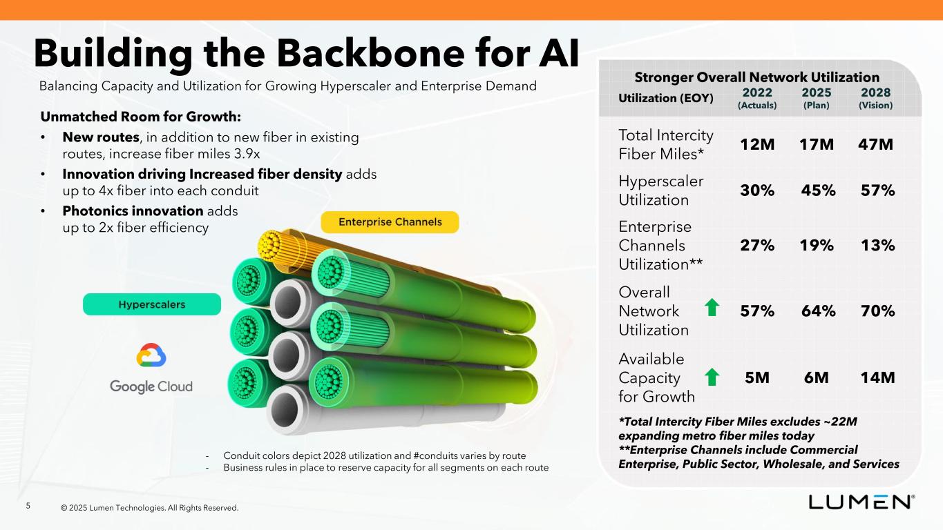 © 2025 Lumen Technologies. All Rights Reserved. 4 2025 Company Goals Drive Operational Excellence Build the Backbone for AI Economy Cloudify Telecom Deliver Lumen financial goals (revenue, EBITDA, FCF) Build out new: Meet & Exceed our Big Tech and AI commitments Maintain existing: High performance, expansive, & resilient network Drive PCF adoption across industries to connect data centers Transform economics by unlocking physical port limitations Drive Lumen Digital platform adoption Launch new multi-cloud capabilities to drive rev growth Build growth engine: sales execution, CX, churn, etc. Modernize key systems: ERP, Sales and Operations Simplify: Unify network, decommission ecosystem, clear product & solution GTM Continue to transform our workforce and culture