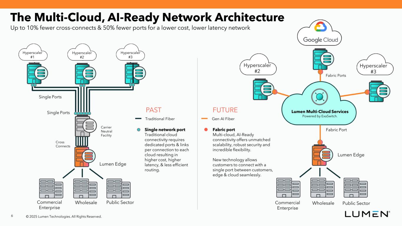 © 2025 Lumen Technologies. All Rights Reserved. 5 Utilization (EOY) 2022 (Actuals) 2025 (Plan) 2028 (Vision) Total Intercity Fiber Miles* 12M 17M 47M Hyperscaler Utilization 30% 45% 57% Enterprise Channels Utilization** 27% 19% 13% Overall Network Utilization 57% 64% 70% Available Capacity for Growth 5M 6M 14M Building the Backbone for AI Balancing Capacity and Utilization for Growing Hyperscaler and Enterprise Demand Unmatched Room for Growth: • New routes, in addition to new fiber in existing routes, increase fiber miles 3.9x • Innovation driving Increased fiber density adds up to 4x fiber into each conduit • Photonics innovation adds up to 2x fiber efficiency *Total Intercity Fiber Miles excludes ~22M expanding metro fiber miles today **Enterprise Channels include Commercial Enterprise, Public Sector, Wholesale, and Services - Conduit colors depict 2028 utilization and #conduits varies by route - Business rules in place to reserve capacity for all segments on each route Stronger Overall Network Utilization