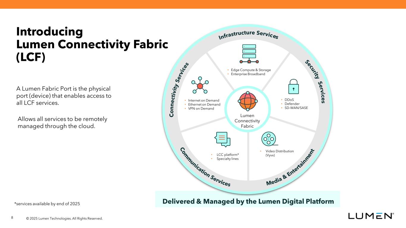 © 2025 Lumen Technologies. All Rights Reserved. 7 'Cloudified' TelecomTraditional Telecom Capital and labor intensive economics: • Static, point to point • Analog CX, slow, and people heavy • Impeded growth often supporting 1 service per port • Linear cost and revenue growth Cloud economics: • Dynamic, 1-to-many • Digital CX enabled by platform • Frictionless growth enabled by 'Fabric Ports' (thousands of services per port) Disruption Frictionless Growth Potential: Cloudifying Telco