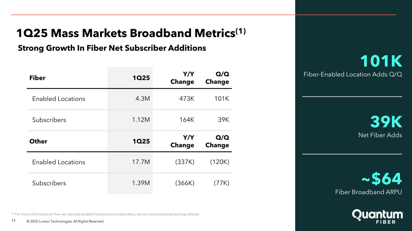 © 2025 Lumen Technologies. All Rights Reserved. 13 1Q25 Mass Markets Revenue 35% 38% 40% 42% 45% 1Q24 2Q24 3Q24 4Q24 1Q25 Fiber Revenue Contribution to Total Broadband Revenue ($ in millions) 1Q25 Y/Y% Change % Total Fiber Broadband $209 22.9% 32% Other Broadband(1) $257 (18.4%) 39% Voice & Other $192 (10.3%) 29% Total Mass Markets $658 (5.9%) 100% Fiber Broadband Revenue Growth Accelerated (1) Other Broadband revenue primarily includes revenue from lower speed copper-based broadband services marketed under the CenturyLink brand.