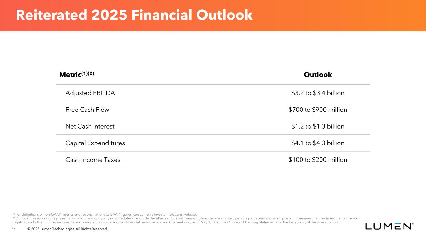 © 2025 Lumen Technologies. All Rights Reserved. 16 Consolidated Cash Flow Summary ($ in millions) 1Q25 Cash Flow from Operations $1,095 Capital Expenditures $791 Free Cash Flow $354 Net Cash Interest $259 Key Metrics