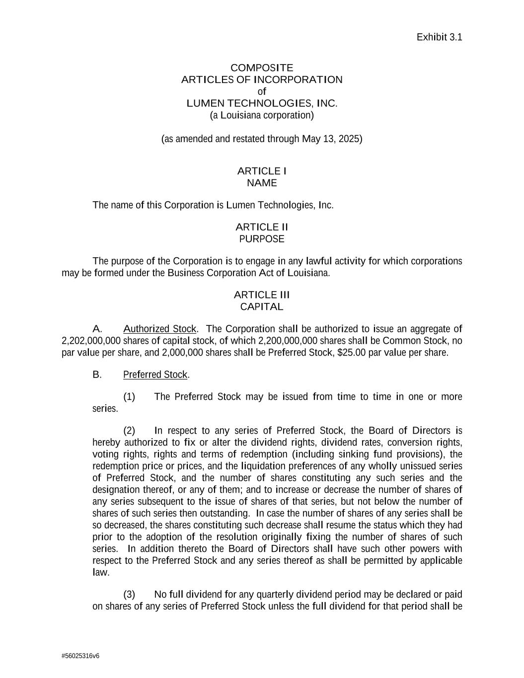 Exhibit 3.1 #56025316v6 COMPOSITE ARTICLES OF INCORPORATION of LUMEN TECHNOLOGIES, INC. (a Louisiana corporation) (as amended and restated through May 13, 2025) ARTICLE I NAME The name of this Corporation is Lumen Technologies, Inc. ARTICLE II PURPOSE The purpose of the Corporation is to engage in any lawful activity for which corporations may be formed under the Business Corporation Act of Louisiana. ARTICLE III CAPITAL A. Authorized Stock. The Corporation shall be authorized to issue an aggregate of 2,202,000,000 shares of capital stock, of which 2,200,000,000 shares shall be Common Stock, no par value per share, and 2,000,000 shares shall be Preferred Stock, $25.00 par value per share. B. Preferred Stock. (1) The Preferred Stock may be issued from time to time in one or more series. (2) In respect to any series of Preferred Stock, the Board of Directors is hereby authorized to fix or alter the dividend rights, dividend rates, conversion rights, voting rights, rights and terms of redemption (including sinking fund provisions), the redemption price or prices, and the liquidation preferences of any wholly unissued series of Preferred Stock, and the number of shares constituting any such series and the designation thereof, or any of them; and to increase or decrease the number of shares of any series subsequent to the issue of shares of that series, but not below the number of shares of such series then outstanding. In case the number of shares of any series shall be so decreased, the shares constituting such decrease shall resume the status which they had prior to the adoption of the resolution originally fixing the number of shares of such series. In addition thereto the Board of Directors shall have such other powers with respect to the Preferred Stock and any series thereof as shall be permitted by applicable law. (3) No full dividend for any quarterly dividend period may be declared or paid on shares of any series of Preferred Stock unless the full dividend for that period shall be