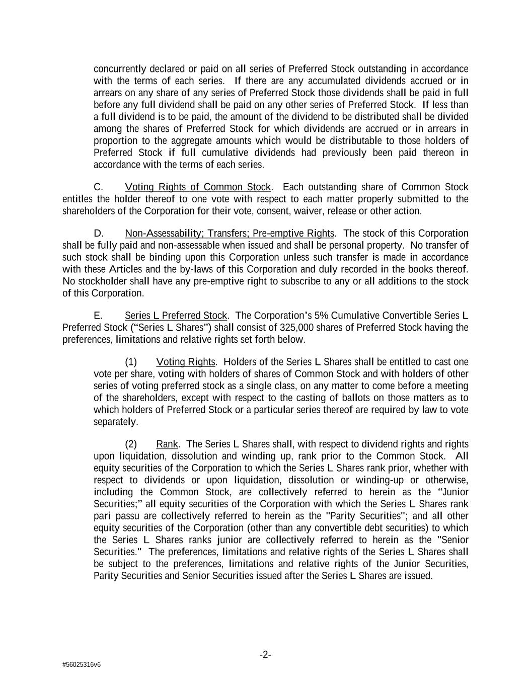 -2- #56025316v6 concurrently declared or paid on all series of Preferred Stock outstanding in accordance with the terms of each series. If there are any accumulated dividends accrued or in arrears on any share of any series of Preferred Stock those dividends shall be paid in full before any full dividend shall be paid on any other series of Preferred Stock. If less than a full dividend is to be paid, the amount of the dividend to be distributed shall be divided among the shares of Preferred Stock for which dividends are accrued or in arrears in proportion to the aggregate amounts which would be distributable to those holders of Preferred Stock if full cumulative dividends had previously been paid thereon in accordance with the terms of each series. C. Voting Rights of Common Stock. Each outstanding share of Common Stock entitles the holder thereof to one vote with respect to each matter properly submitted to the shareholders of the Corporation for their vote, consent, waiver, release or other action. D. Non-Assessability; Transfers; Pre-emptive Rights. The stock of this Corporation shall be fully paid and non-assessable when issued and shall be personal property. No transfer of such stock shall be binding upon this Corporation unless such transfer is made in accordance with these Articles and the by-laws of this Corporation and duly recorded in the books thereof. No stockholder shall have any pre-emptive right to subscribe to any or all additions to the stock of this Corporation. E. Series L Preferred Stock. The Corporation’s 5% Cumulative Convertible Series L Preferred Stock (“Series L Shares”) shall consist of 325,000 shares of Preferred Stock having the preferences, limitations and relative rights set forth below. (1) Voting Rights. Holders of the Series L Shares shall be entitled to cast one vote per share, voting with holders of shares of Common Stock and with holders of other series of voting preferred stock as a single class, on any matter to come before a meeting of the shareholders, except with respect to the casting of ballots on those matters as to which holders of Preferred Stock or a particular series thereof are required by law to vote separately. (2) Rank. The Series L Shares shall, with respect to dividend rights and rights upon liquidation, dissolution and winding up, rank prior to the Common Stock. All equity securities of the Corporation to which the Series L Shares rank prior, whether with respect to dividends or upon liquidation, dissolution or winding-up or otherwise, including the Common Stock, are collectively referred to herein as the “Junior Securities;” all equity securities of the Corporation with which the Series L Shares rank pari passu are collectively referred to herein as the "Parity Securities"; and all other equity securities of the Corporation (other than any convertible debt securities) to which the Series L Shares ranks junior are collectively referred to herein as the "Senior Securities." The preferences, limitations and relative rights of the Series L Shares shall be subject to the preferences, limitations and relative rights of the Junior Securities, Parity Securities and Senior Securities issued after the Series L Shares are issued.