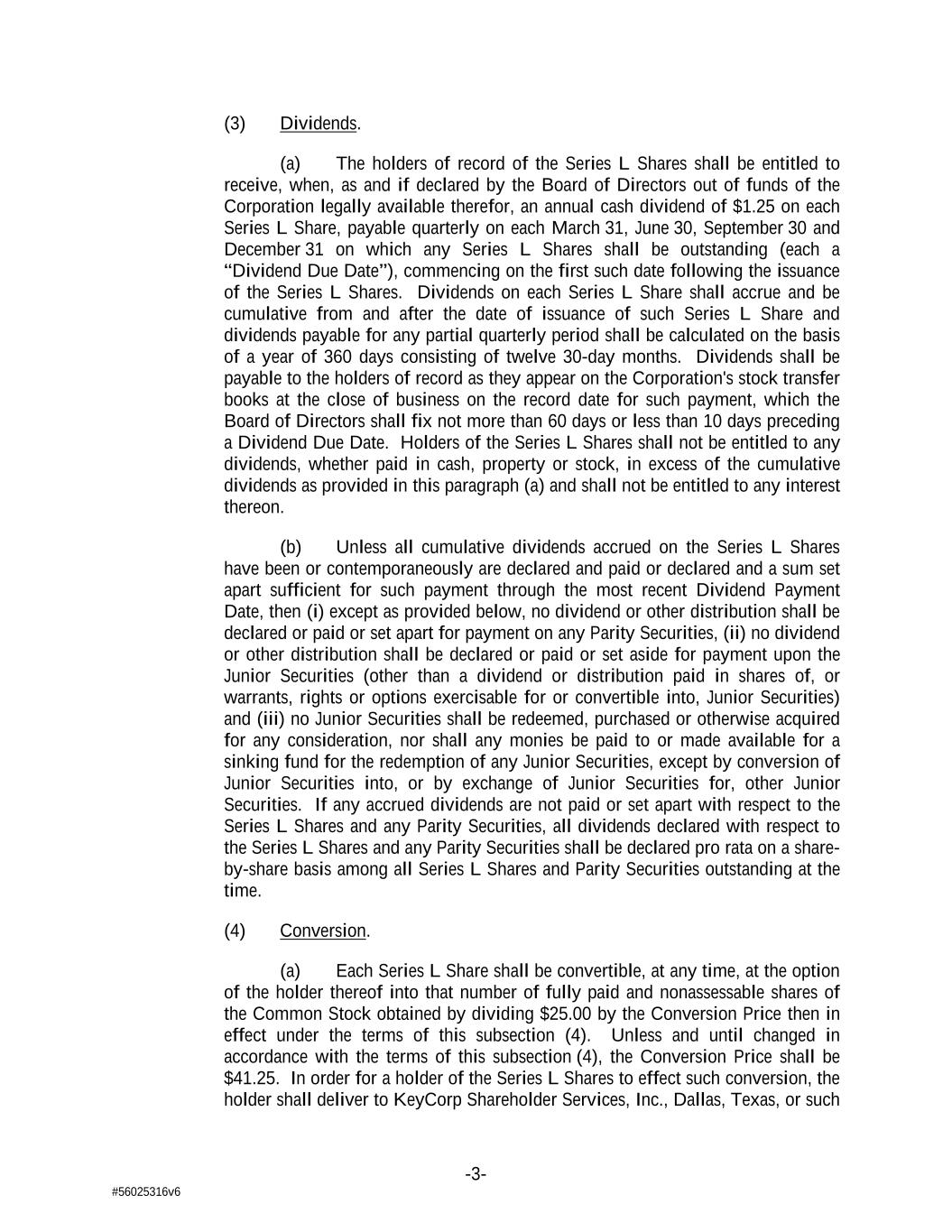 -3- #56025316v6 (3) Dividends. (a) The holders of record of the Series L Shares shall be entitled to receive, when, as and if declared by the Board of Directors out of funds of the Corporation legally available therefor, an annual cash dividend of $1.25 on each Series L Share, payable quarterly on each March 31, June 30, September 30 and December 31 on which any Series L Shares shall be outstanding (each a “Dividend Due Date”), commencing on the first such date following the issuance of the Series L Shares. Dividends on each Series L Share shall accrue and be cumulative from and after the date of issuance of such Series L Share and dividends payable for any partial quarterly period shall be calculated on the basis of a year of 360 days consisting of twelve 30-day months. Dividends shall be payable to the holders of record as they appear on the Corporation's stock transfer books at the close of business on the record date for such payment, which the Board of Directors shall fix not more than 60 days or less than 10 days preceding a Dividend Due Date. Holders of the Series L Shares shall not be entitled to any dividends, whether paid in cash, property or stock, in excess of the cumulative dividends as provided in this paragraph (a) and shall not be entitled to any interest thereon. (b) Unless all cumulative dividends accrued on the Series L Shares have been or contemporaneously are declared and paid or declared and a sum set apart sufficient for such payment through the most recent Dividend Payment Date, then (i) except as provided below, no dividend or other distribution shall be declared or paid or set apart for payment on any Parity Securities, (ii) no dividend or other distribution shall be declared or paid or set aside for payment upon the Junior Securities (other than a dividend or distribution paid in shares of, or warrants, rights or options exercisable for or convertible into, Junior Securities) and (iii) no Junior Securities shall be redeemed, purchased or otherwise acquired for any consideration, nor shall any monies be paid to or made available for a sinking fund for the redemption of any Junior Securities, except by conversion of Junior Securities into, or by exchange of Junior Securities for, other Junior Securities. If any accrued dividends are not paid or set apart with respect to the Series L Shares and any Parity Securities, all dividends declared with respect to the Series L Shares and any Parity Securities shall be declared pro rata on a share- by-share basis among all Series L Shares and Parity Securities outstanding at the time. (4) Conversion. (a) Each Series L Share shall be convertible, at any time, at the option of the holder thereof into that number of fully paid and nonassessable shares of the Common Stock obtained by dividing $25.00 by the Conversion Price then in effect under the terms of this subsection (4). Unless and until changed in accordance with the terms of this subsection (4), the Conversion Price shall be $41.25. In order for a holder of the Series L Shares to effect such conversion, the holder shall deliver to KeyCorp Shareholder Services, Inc., Dallas, Texas, or such