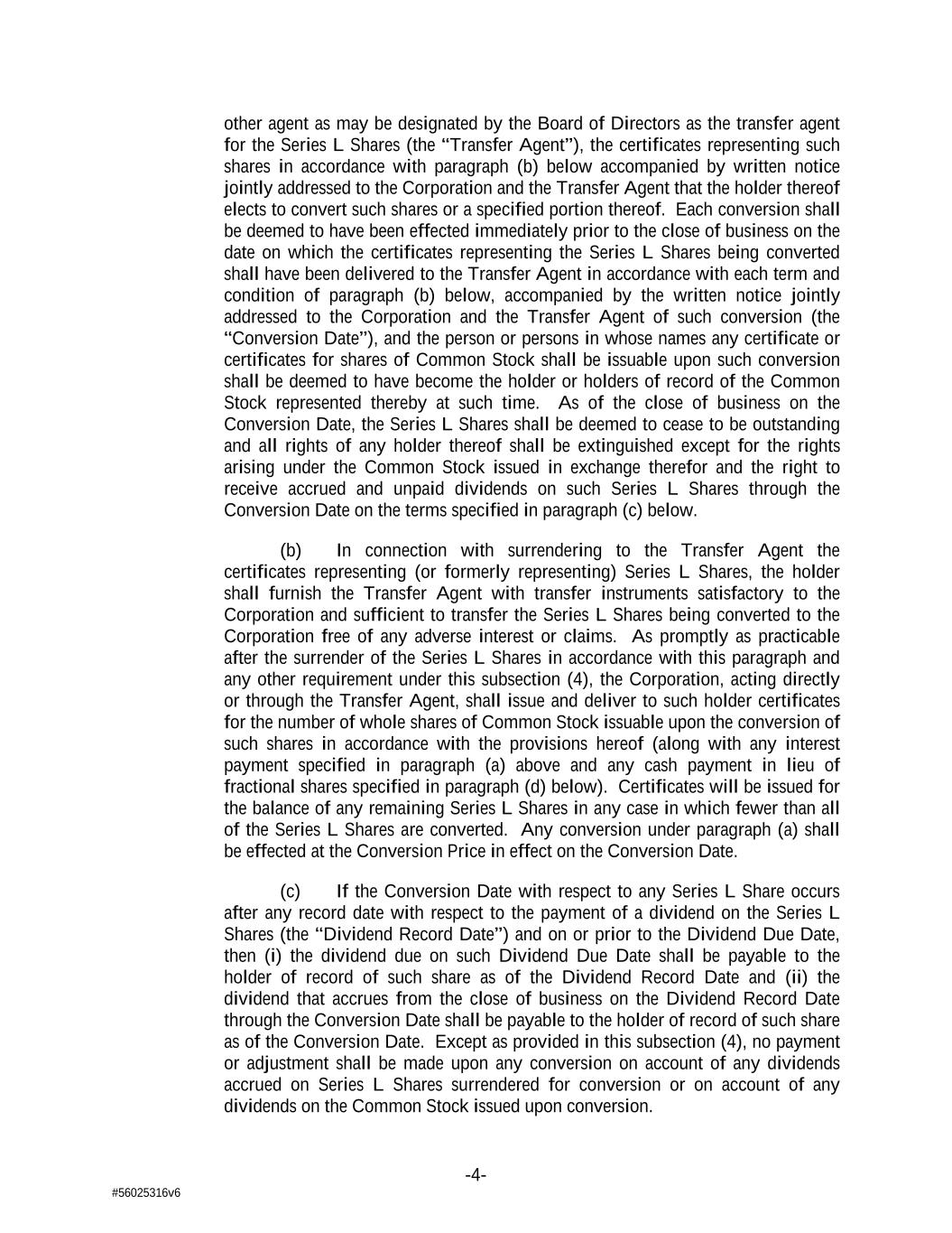 -4- #56025316v6 other agent as may be designated by the Board of Directors as the transfer agent for the Series L Shares (the “Transfer Agent”), the certificates representing such shares in accordance with paragraph (b) below accompanied by written notice jointly addressed to the Corporation and the Transfer Agent that the holder thereof elects to convert such shares or a specified portion thereof. Each conversion shall be deemed to have been effected immediately prior to the close of business on the date on which the certificates representing the Series L Shares being converted shall have been delivered to the Transfer Agent in accordance with each term and condition of paragraph (b) below, accompanied by the written notice jointly addressed to the Corporation and the Transfer Agent of such conversion (the “Conversion Date”), and the person or persons in whose names any certificate or certificates for shares of Common Stock shall be issuable upon such conversion shall be deemed to have become the holder or holders of record of the Common Stock represented thereby at such time. As of the close of business on the Conversion Date, the Series L Shares shall be deemed to cease to be outstanding and all rights of any holder thereof shall be extinguished except for the rights arising under the Common Stock issued in exchange therefor and the right to receive accrued and unpaid dividends on such Series L Shares through the Conversion Date on the terms specified in paragraph (c) below. (b) In connection with surrendering to the Transfer Agent the certificates representing (or formerly representing) Series L Shares, the holder shall furnish the Transfer Agent with transfer instruments satisfactory to the Corporation and sufficient to transfer the Series L Shares being converted to the Corporation free of any adverse interest or claims. As promptly as practicable after the surrender of the Series L Shares in accordance with this paragraph and any other requirement under this subsection (4), the Corporation, acting directly or through the Transfer Agent, shall issue and deliver to such holder certificates for the number of whole shares of Common Stock issuable upon the conversion of such shares in accordance with the provisions hereof (along with any interest payment specified in paragraph (a) above and any cash payment in lieu of fractional shares specified in paragraph (d) below). Certificates will be issued for the balance of any remaining Series L Shares in any case in which fewer than all of the Series L Shares are converted. Any conversion under paragraph (a) shall be effected at the Conversion Price in effect on the Conversion Date. (c) If the Conversion Date with respect to any Series L Share occurs after any record date with respect to the payment of a dividend on the Series L Shares (the “Dividend Record Date”) and on or prior to the Dividend Due Date, then (i) the dividend due on such Dividend Due Date shall be payable to the holder of record of such share as of the Dividend Record Date and (ii) the dividend that accrues from the close of business on the Dividend Record Date through the Conversion Date shall be payable to the holder of record of such share as of the Conversion Date. Except as provided in this subsection (4), no payment or adjustment shall be made upon any conversion on account of any dividends accrued on Series L Shares surrendered for conversion or on account of any dividends on the Common Stock issued upon conversion.
