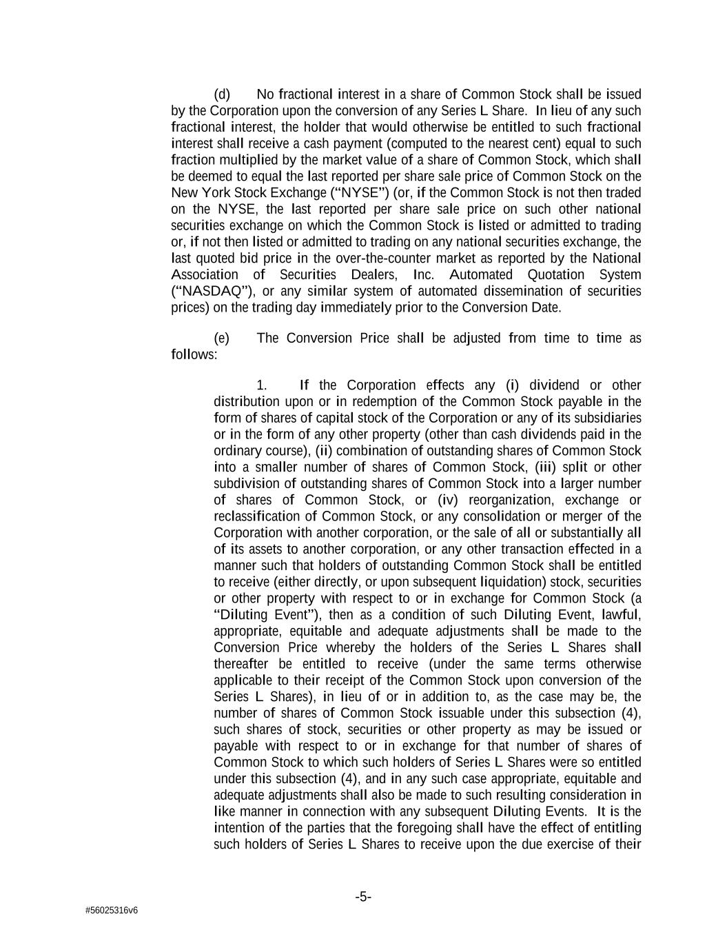 -5- #56025316v6 (d) No fractional interest in a share of Common Stock shall be issued by the Corporation upon the conversion of any Series L Share. In lieu of any such fractional interest, the holder that would otherwise be entitled to such fractional interest shall receive a cash payment (computed to the nearest cent) equal to such fraction multiplied by the market value of a share of Common Stock, which shall be deemed to equal the last reported per share sale price of Common Stock on the New York Stock Exchange (“NYSE”) (or, if the Common Stock is not then traded on the NYSE, the last reported per share sale price on such other national securities exchange on which the Common Stock is listed or admitted to trading or, if not then listed or admitted to trading on any national securities exchange, the last quoted bid price in the over-the-counter market as reported by the National Association of Securities Dealers, Inc. Automated Quotation System (“NASDAQ”), or any similar system of automated dissemination of securities prices) on the trading day immediately prior to the Conversion Date. (e) The Conversion Price shall be adjusted from time to time as follows: 1. If the Corporation effects any (i) dividend or other distribution upon or in redemption of the Common Stock payable in the form of shares of capital stock of the Corporation or any of its subsidiaries or in the form of any other property (other than cash dividends paid in the ordinary course), (ii) combination of outstanding shares of Common Stock into a smaller number of shares of Common Stock, (iii) split or other subdivision of outstanding shares of Common Stock into a larger number of shares of Common Stock, or (iv) reorganization, exchange or reclassification of Common Stock, or any consolidation or merger of the Corporation with another corporation, or the sale of all or substantially all of its assets to another corporation, or any other transaction effected in a manner such that holders of outstanding Common Stock shall be entitled to receive (either directly, or upon subsequent liquidation) stock, securities or other property with respect to or in exchange for Common Stock (a “Diluting Event”), then as a condition of such Diluting Event, lawful, appropriate, equitable and adequate adjustments shall be made to the Conversion Price whereby the holders of the Series L Shares shall thereafter be entitled to receive (under the same terms otherwise applicable to their receipt of the Common Stock upon conversion of the Series L Shares), in lieu of or in addition to, as the case may be, the number of shares of Common Stock issuable under this subsection (4), such shares of stock, securities or other property as may be issued or payable with respect to or in exchange for that number of shares of Common Stock to which such holders of Series L Shares were so entitled under this subsection (4), and in any such case appropriate, equitable and adequate adjustments shall also be made to such resulting consideration in like manner in connection with any subsequent Diluting Events. It is the intention of the parties that the foregoing shall have the effect of entitling such holders of Series L Shares to receive upon the due exercise of their