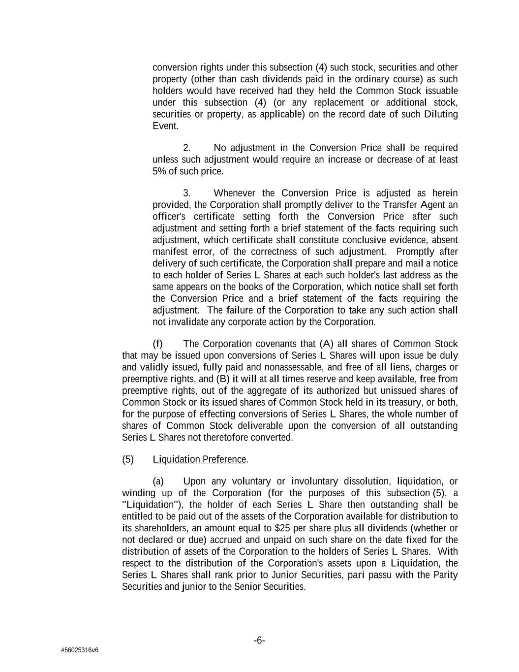 -6- #56025316v6 conversion rights under this subsection (4) such stock, securities and other property (other than cash dividends paid in the ordinary course) as such holders would have received had they held the Common Stock issuable under this subsection (4) (or any replacement or additional stock, securities or property, as applicable) on the record date of such Diluting Event. 2. No adjustment in the Conversion Price shall be required unless such adjustment would require an increase or decrease of at least 5% of such price. 3. Whenever the Conversion Price is adjusted as herein provided, the Corporation shall promptly deliver to the Transfer Agent an officer's certificate setting forth the Conversion Price after such adjustment and setting forth a brief statement of the facts requiring such adjustment, which certificate shall constitute conclusive evidence, absent manifest error, of the correctness of such adjustment. Promptly after delivery of such certificate, the Corporation shall prepare and mail a notice to each holder of Series L Shares at each such holder's last address as the same appears on the books of the Corporation, which notice shall set forth the Conversion Price and a brief statement of the facts requiring the adjustment. The failure of the Corporation to take any such action shall not invalidate any corporate action by the Corporation. (f) The Corporation covenants that (A) all shares of Common Stock that may be issued upon conversions of Series L Shares will upon issue be duly and validly issued, fully paid and nonassessable, and free of all liens, charges or preemptive rights, and (B) it will at all times reserve and keep available, free from preemptive rights, out of the aggregate of its authorized but unissued shares of Common Stock or its issued shares of Common Stock held in its treasury, or both, for the purpose of effecting conversions of Series L Shares, the whole number of shares of Common Stock deliverable upon the conversion of all outstanding Series L Shares not theretofore converted. (5) Liquidation Preference. (a) Upon any voluntary or involuntary dissolution, liquidation, or winding up of the Corporation (for the purposes of this subsection (5), a "Liquidation"), the holder of each Series L Share then outstanding shall be entitled to be paid out of the assets of the Corporation available for distribution to its shareholders, an amount equal to $25 per share plus all dividends (whether or not declared or due) accrued and unpaid on such share on the date fixed for the distribution of assets of the Corporation to the holders of Series L Shares. With respect to the distribution of the Corporation's assets upon a Liquidation, the Series L Shares shall rank prior to Junior Securities, pari passu with the Parity Securities and junior to the Senior Securities.
