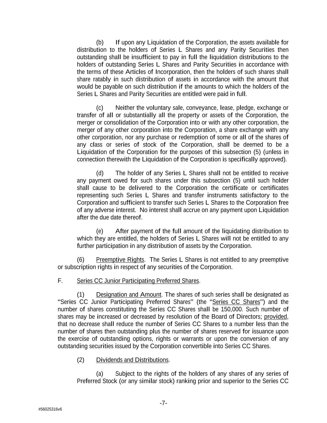 -7- #56025316v6 (b) If upon any Liquidation of the Corporation, the assets available for distribution to the holders of Series L Shares and any Parity Securities then outstanding shall be insufficient to pay in full the liquidation distributions to the holders of outstanding Series L Shares and Parity Securities in accordance with the terms of these Articles of Incorporation, then the holders of such shares shall share ratably in such distribution of assets in accordance with the amount that would be payable on such distribution if the amounts to which the holders of the Series L Shares and Parity Securities are entitled were paid in full. (c) Neither the voluntary sale, conveyance, lease, pledge, exchange or transfer of all or substantially all the property or assets of the Corporation, the merger or consolidation of the Corporation into or with any other corporation, the merger of any other corporation into the Corporation, a share exchange with any other corporation, nor any purchase or redemption of some or all of the shares of any class or series of stock of the Corporation, shall be deemed to be a Liquidation of the Corporation for the purposes of this subsection (5) (unless in connection therewith the Liquidation of the Corporation is specifically approved). (d) The holder of any Series L Shares shall not be entitled to receive any payment owed for such shares under this subsection (5) until such holder shall cause to be delivered to the Corporation the certificate or certificates representing such Series L Shares and transfer instruments satisfactory to the Corporation and sufficient to transfer such Series L Shares to the Corporation free of any adverse interest. No interest shall accrue on any payment upon Liquidation after the due date thereof. (e) After payment of the full amount of the liquidating distribution to which they are entitled, the holders of Series L Shares will not be entitled to any further participation in any distribution of assets by the Corporation. (6) Preemptive Rights. The Series L Shares is not entitled to any preemptive or subscription rights in respect of any securities of the Corporation. F. Series CC Junior Participating Preferred Shares. (1) Designation and Amount. The shares of such series shall be designated as “Series CC Junior Participating Preferred Shares” (the “Series CC Shares”) and the number of shares constituting the Series CC Shares shall be 150,000. Such number of shares may be increased or decreased by resolution of the Board of Directors; provided, that no decrease shall reduce the number of Series CC Shares to a number less than the number of shares then outstanding plus the number of shares reserved for issuance upon the exercise of outstanding options, rights or warrants or upon the conversion of any outstanding securities issued by the Corporation convertible into Series CC Shares. (2) Dividends and Distributions. (a) Subject to the rights of the holders of any shares of any series of Preferred Stock (or any similar stock) ranking prior and superior to the Series CC