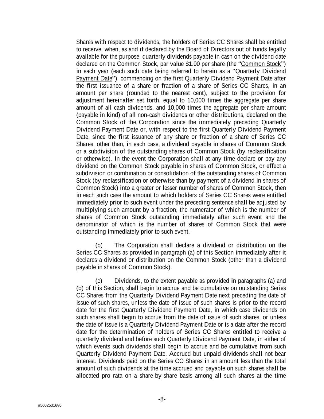 -8- #56025316v6 Shares with respect to dividends, the holders of Series CC Shares shall be entitled to receive, when, as and if declared by the Board of Directors out of funds legally available for the purpose, quarterly dividends payable in cash on the dividend date declared on the Common Stock, par value $1.00 per share (the “Common Stock”) in each year (each such date being referred to herein as a “Quarterly Dividend Payment Date”), commencing on the first Quarterly Dividend Payment Date after the first issuance of a share or fraction of a share of Series CC Shares, in an amount per share (rounded to the nearest cent), subject to the provision for adjustment hereinafter set forth, equal to 10,000 times the aggregate per share amount of all cash dividends, and 10,000 times the aggregate per share amount (payable in kind) of all non-cash dividends or other distributions, declared on the Common Stock of the Corporation since the immediately preceding Quarterly Dividend Payment Date or, with respect to the first Quarterly Dividend Payment Date, since the first issuance of any share or fraction of a share of Series CC Shares, other than, in each case, a dividend payable in shares of Common Stock or a subdivision of the outstanding shares of Common Stock (by reclassification or otherwise). In the event the Corporation shall at any time declare or pay any dividend on the Common Stock payable in shares of Common Stock, or effect a subdivision or combination or consolidation of the outstanding shares of Common Stock (by reclassification or otherwise than by payment of a dividend in shares of Common Stock) into a greater or lesser number of shares of Common Stock, then in each such case the amount to which holders of Series CC Shares were entitled immediately prior to such event under the preceding sentence shall be adjusted by multiplying such amount by a fraction, the numerator of which is the number of shares of Common Stock outstanding immediately after such event and the denominator of which is the number of shares of Common Stock that were outstanding immediately prior to such event. (b) The Corporation shall declare a dividend or distribution on the Series CC Shares as provided in paragraph (a) of this Section immediately after it declares a dividend or distribution on the Common Stock (other than a dividend payable in shares of Common Stock). (c) Dividends, to the extent payable as provided in paragraphs (a) and (b) of this Section, shall begin to accrue and be cumulative on outstanding Series CC Shares from the Quarterly Dividend Payment Date next preceding the date of issue of such shares, unless the date of issue of such shares is prior to the record date for the first Quarterly Dividend Payment Date, in which case dividends on such shares shall begin to accrue from the date of issue of such shares, or unless the date of issue is a Quarterly Dividend Payment Date or is a date after the record date for the determination of holders of Series CC Shares entitled to receive a quarterly dividend and before such Quarterly Dividend Payment Date, in either of which events such dividends shall begin to accrue and be cumulative from such Quarterly Dividend Payment Date. Accrued but unpaid dividends shall not bear interest. Dividends paid on the Series CC Shares in an amount less than the total amount of such dividends at the time accrued and payable on such shares shall be allocated pro rata on a share-by-share basis among all such shares at the time