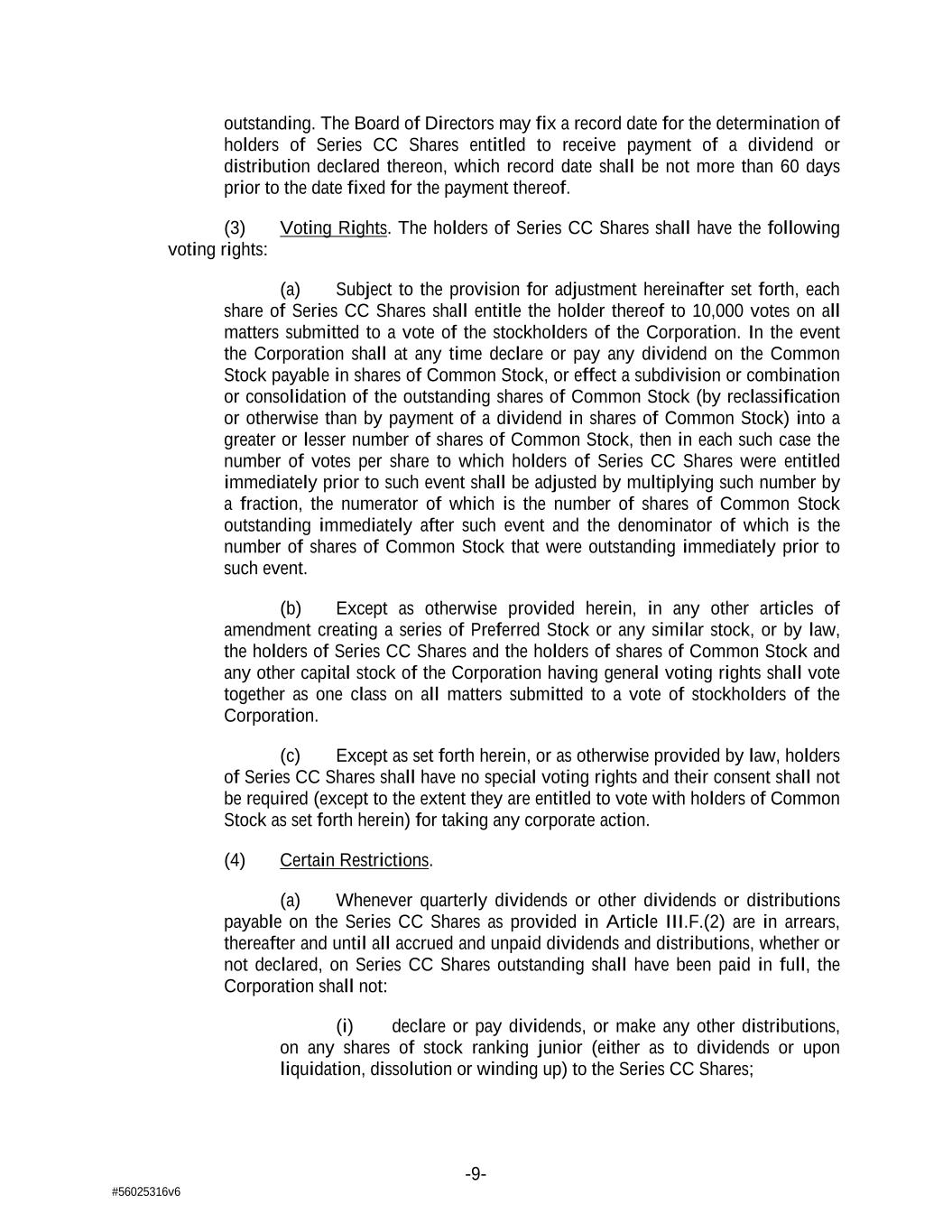 -9- #56025316v6 outstanding. The Board of Directors may fix a record date for the determination of holders of Series CC Shares entitled to receive payment of a dividend or distribution declared thereon, which record date shall be not more than 60 days prior to the date fixed for the payment thereof. (3) Voting Rights. The holders of Series CC Shares shall have the following voting rights: (a) Subject to the provision for adjustment hereinafter set forth, each share of Series CC Shares shall entitle the holder thereof to 10,000 votes on all matters submitted to a vote of the stockholders of the Corporation. In the event the Corporation shall at any time declare or pay any dividend on the Common Stock payable in shares of Common Stock, or effect a subdivision or combination or consolidation of the outstanding shares of Common Stock (by reclassification or otherwise than by payment of a dividend in shares of Common Stock) into a greater or lesser number of shares of Common Stock, then in each such case the number of votes per share to which holders of Series CC Shares were entitled immediately prior to such event shall be adjusted by multiplying such number by a fraction, the numerator of which is the number of shares of Common Stock outstanding immediately after such event and the denominator of which is the number of shares of Common Stock that were outstanding immediately prior to such event. (b) Except as otherwise provided herein, in any other articles of amendment creating a series of Preferred Stock or any similar stock, or by law, the holders of Series CC Shares and the holders of shares of Common Stock and any other capital stock of the Corporation having general voting rights shall vote together as one class on all matters submitted to a vote of stockholders of the Corporation. (c) Except as set forth herein, or as otherwise provided by law, holders of Series CC Shares shall have no special voting rights and their consent shall not be required (except to the extent they are entitled to vote with holders of Common Stock as set forth herein) for taking any corporate action. (4) Certain Restrictions. (a) Whenever quarterly dividends or other dividends or distributions payable on the Series CC Shares as provided in Article III.F.(2) are in arrears, thereafter and until all accrued and unpaid dividends and distributions, whether or not declared, on Series CC Shares outstanding shall have been paid in full, the Corporation shall not: (i) declare or pay dividends, or make any other distributions, on any shares of stock ranking junior (either as to dividends or upon liquidation, dissolution or winding up) to the Series CC Shares;