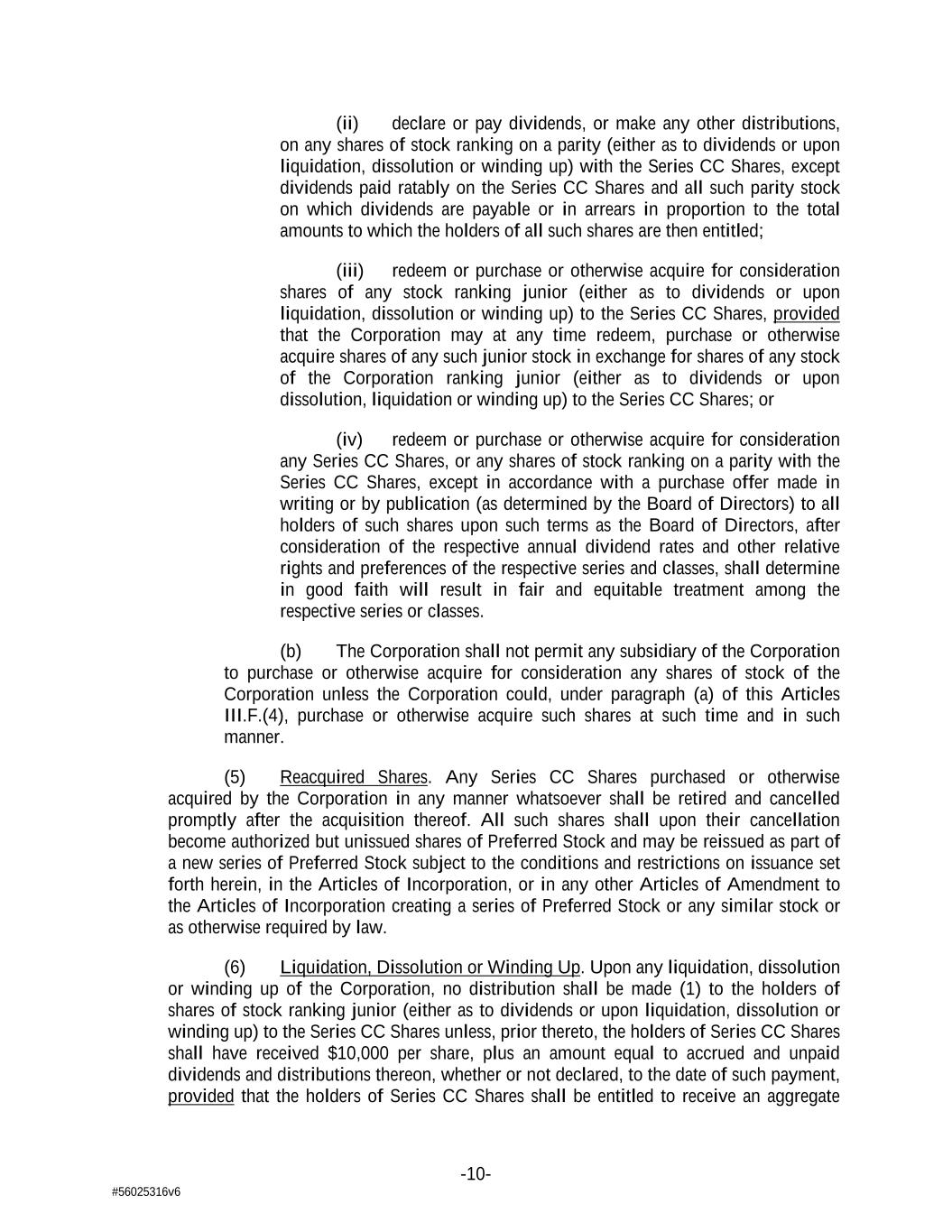 -10- #56025316v6 (ii) declare or pay dividends, or make any other distributions, on any shares of stock ranking on a parity (either as to dividends or upon liquidation, dissolution or winding up) with the Series CC Shares, except dividends paid ratably on the Series CC Shares and all such parity stock on which dividends are payable or in arrears in proportion to the total amounts to which the holders of all such shares are then entitled; (iii) redeem or purchase or otherwise acquire for consideration shares of any stock ranking junior (either as to dividends or upon liquidation, dissolution or winding up) to the Series CC Shares, provided that the Corporation may at any time redeem, purchase or otherwise acquire shares of any such junior stock in exchange for shares of any stock of the Corporation ranking junior (either as to dividends or upon dissolution, liquidation or winding up) to the Series CC Shares; or (iv) redeem or purchase or otherwise acquire for consideration any Series CC Shares, or any shares of stock ranking on a parity with the Series CC Shares, except in accordance with a purchase offer made in writing or by publication (as determined by the Board of Directors) to all holders of such shares upon such terms as the Board of Directors, after consideration of the respective annual dividend rates and other relative rights and preferences of the respective series and classes, shall determine in good faith will result in fair and equitable treatment among the respective series or classes. (b) The Corporation shall not permit any subsidiary of the Corporation to purchase or otherwise acquire for consideration any shares of stock of the Corporation unless the Corporation could, under paragraph (a) of this Articles III.F.(4), purchase or otherwise acquire such shares at such time and in such manner. (5) Reacquired Shares. Any Series CC Shares purchased or otherwise acquired by the Corporation in any manner whatsoever shall be retired and cancelled promptly after the acquisition thereof. All such shares shall upon their cancellation become authorized but unissued shares of Preferred Stock and may be reissued as part of a new series of Preferred Stock subject to the conditions and restrictions on issuance set forth herein, in the Articles of Incorporation, or in any other Articles of Amendment to the Articles of Incorporation creating a series of Preferred Stock or any similar stock or as otherwise required by law. (6) Liquidation, Dissolution or Winding Up. Upon any liquidation, dissolution or winding up of the Corporation, no distribution shall be made (1) to the holders of shares of stock ranking junior (either as to dividends or upon liquidation, dissolution or winding up) to the Series CC Shares unless, prior thereto, the holders of Series CC Shares shall have received $10,000 per share, plus an amount equal to accrued and unpaid dividends and distributions thereon, whether or not declared, to the date of such payment, provided that the holders of Series CC Shares shall be entitled to receive an aggregate