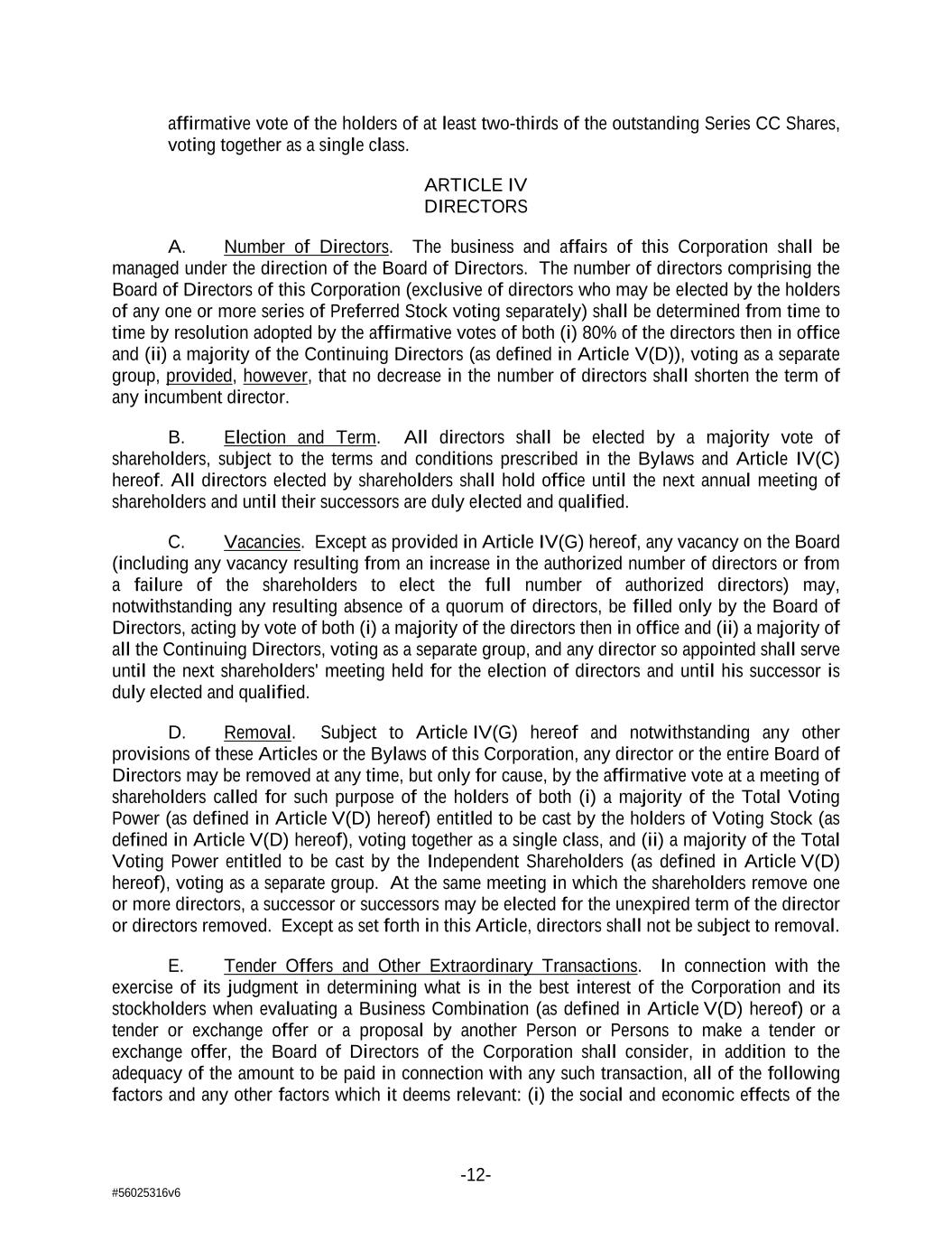 -12- #56025316v6 affirmative vote of the holders of at least two-thirds of the outstanding Series CC Shares, voting together as a single class. ARTICLE IV DIRECTORS A. Number of Directors. The business and affairs of this Corporation shall be managed under the direction of the Board of Directors. The number of directors comprising the Board of Directors of this Corporation (exclusive of directors who may be elected by the holders of any one or more series of Preferred Stock voting separately) shall be determined from time to time by resolution adopted by the affirmative votes of both (i) 80% of the directors then in office and (ii) a majority of the Continuing Directors (as defined in Article V(D)), voting as a separate group, provided, however, that no decrease in the number of directors shall shorten the term of any incumbent director. B. Election and Term. All directors shall be elected by a majority vote of shareholders, subject to the terms and conditions prescribed in the Bylaws and Article IV(C) hereof. All directors elected by shareholders shall hold office until the next annual meeting of shareholders and until their successors are duly elected and qualified. C. Vacancies. Except as provided in Article IV(G) hereof, any vacancy on the Board (including any vacancy resulting from an increase in the authorized number of directors or from a failure of the shareholders to elect the full number of authorized directors) may, notwithstanding any resulting absence of a quorum of directors, be filled only by the Board of Directors, acting by vote of both (i) a majority of the directors then in office and (ii) a majority of all the Continuing Directors, voting as a separate group, and any director so appointed shall serve until the next shareholders' meeting held for the election of directors and until his successor is duly elected and qualified. D. Removal. Subject to Article IV(G) hereof and notwithstanding any other provisions of these Articles or the Bylaws of this Corporation, any director or the entire Board of Directors may be removed at any time, but only for cause, by the affirmative vote at a meeting of shareholders called for such purpose of the holders of both (i) a majority of the Total Voting Power (as defined in Article V(D) hereof) entitled to be cast by the holders of Voting Stock (as defined in Article V(D) hereof), voting together as a single class, and (ii) a majority of the Total Voting Power entitled to be cast by the Independent Shareholders (as defined in Article V(D) hereof), voting as a separate group. At the same meeting in which the shareholders remove one or more directors, a successor or successors may be elected for the unexpired term of the director or directors removed. Except as set forth in this Article, directors shall not be subject to removal. E. Tender Offers and Other Extraordinary Transactions. In connection with the exercise of its judgment in determining what is in the best interest of the Corporation and its stockholders when evaluating a Business Combination (as defined in Article V(D) hereof) or a tender or exchange offer or a proposal by another Person or Persons to make a tender or exchange offer, the Board of Directors of the Corporation shall consider, in addition to the adequacy of the amount to be paid in connection with any such transaction, all of the following factors and any other factors which it deems relevant: (i) the social and economic effects of the