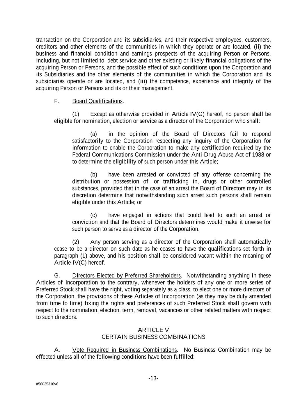 -13- #56025316v6 transaction on the Corporation and its subsidiaries, and their respective employees, customers, creditors and other elements of the communities in which they operate or are located, (ii) the business and financial condition and earnings prospects of the acquiring Person or Persons, including, but not limited to, debt service and other existing or likely financial obligations of the acquiring Person or Persons, and the possible effect of such conditions upon the Corporation and its Subsidiaries and the other elements of the communities in which the Corporation and its subsidiaries operate or are located, and (iii) the competence, experience and integrity of the acquiring Person or Persons and its or their management. F. Board Qualifications. (1) Except as otherwise provided in Article IV(G) hereof, no person shall be eligible for nomination, election or service as a director of the Corporation who shall: (a) in the opinion of the Board of Directors fail to respond satisfactorily to the Corporation respecting any inquiry of the Corporation for information to enable the Corporation to make any certification required by the Federal Communications Commission under the Anti-Drug Abuse Act of 1988 or to determine the eligibility of such person under this Article; (b) have been arrested or convicted of any offense concerning the distribution or possession of, or trafficking in, drugs or other controlled substances, provided that in the case of an arrest the Board of Directors may in its discretion determine that notwithstanding such arrest such persons shall remain eligible under this Article; or (c) have engaged in actions that could lead to such an arrest or conviction and that the Board of Directors determines would make it unwise for such person to serve as a director of the Corporation. (2) Any person serving as a director of the Corporation shall automatically cease to be a director on such date as he ceases to have the qualifications set forth in paragraph (1) above, and his position shall be considered vacant within the meaning of Article IV(C) hereof. G. Directors Elected by Preferred Shareholders. Notwithstanding anything in these Articles of Incorporation to the contrary, whenever the holders of any one or more series of Preferred Stock shall have the right, voting separately as a class, to elect one or more directors of the Corporation, the provisions of these Articles of Incorporation (as they may be duly amended from time to time) fixing the rights and preferences of such Preferred Stock shall govern with respect to the nomination, election, term, removal, vacancies or other related matters with respect to such directors. ARTICLE V CERTAIN BUSINESS COMBINATIONS A. Vote Required in Business Combinations. No Business Combination may be effected unless all of the following conditions have been fulfilled:
