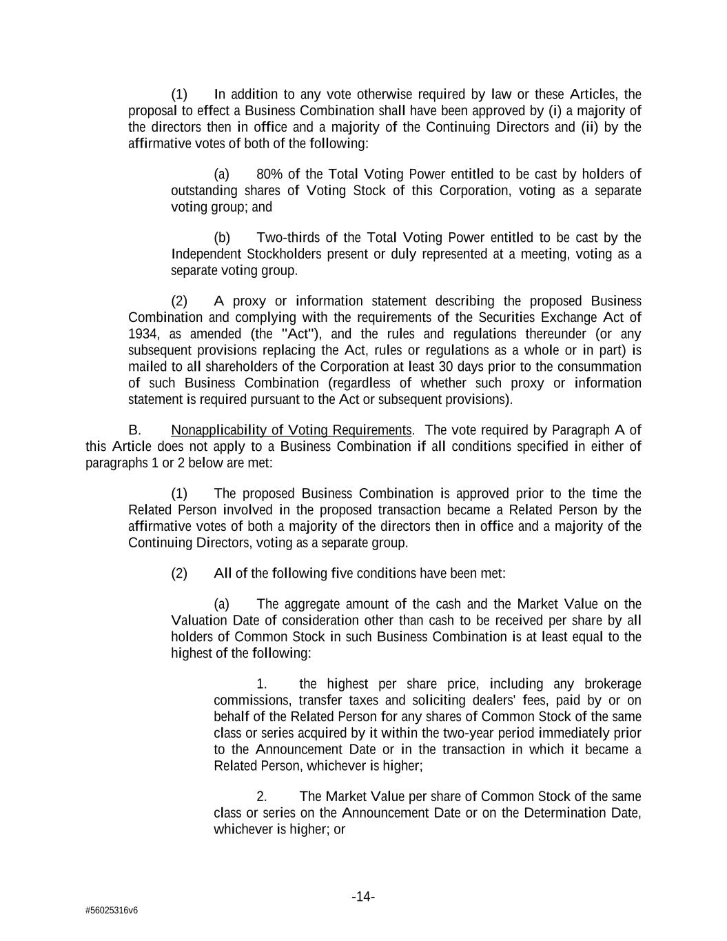 -14- #56025316v6 (1) In addition to any vote otherwise required by law or these Articles, the proposal to effect a Business Combination shall have been approved by (i) a majority of the directors then in office and a majority of the Continuing Directors and (ii) by the affirmative votes of both of the following: (a) 80% of the Total Voting Power entitled to be cast by holders of outstanding shares of Voting Stock of this Corporation, voting as a separate voting group; and (b) Two-thirds of the Total Voting Power entitled to be cast by the Independent Stockholders present or duly represented at a meeting, voting as a separate voting group. (2) A proxy or information statement describing the proposed Business Combination and complying with the requirements of the Securities Exchange Act of 1934, as amended (the "Act"), and the rules and regulations thereunder (or any subsequent provisions replacing the Act, rules or regulations as a whole or in part) is mailed to all shareholders of the Corporation at least 30 days prior to the consummation of such Business Combination (regardless of whether such proxy or information statement is required pursuant to the Act or subsequent provisions). B. Nonapplicability of Voting Requirements. The vote required by Paragraph A of this Article does not apply to a Business Combination if all conditions specified in either of paragraphs 1 or 2 below are met: (1) The proposed Business Combination is approved prior to the time the Related Person involved in the proposed transaction became a Related Person by the affirmative votes of both a majority of the directors then in office and a majority of the Continuing Directors, voting as a separate group. (2) All of the following five conditions have been met: (a) The aggregate amount of the cash and the Market Value on the Valuation Date of consideration other than cash to be received per share by all holders of Common Stock in such Business Combination is at least equal to the highest of the following: 1. the highest per share price, including any brokerage commissions, transfer taxes and soliciting dealers' fees, paid by or on behalf of the Related Person for any shares of Common Stock of the same class or series acquired by it within the two-year period immediately prior to the Announcement Date or in the transaction in which it became a Related Person, whichever is higher; 2. The Market Value per share of Common Stock of the same class or series on the Announcement Date or on the Determination Date, whichever is higher; or