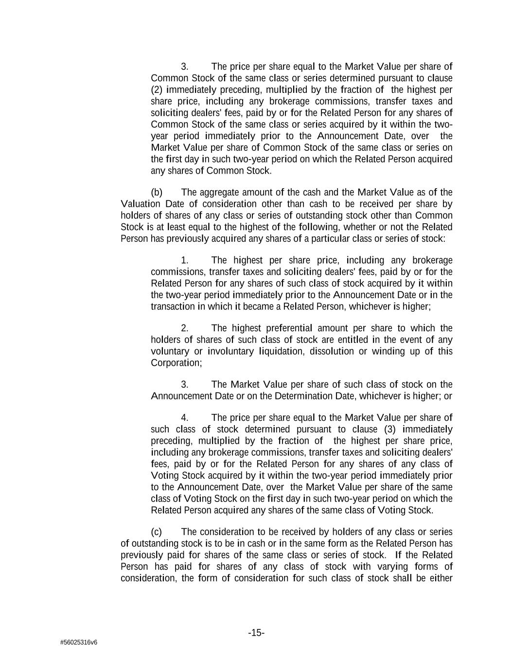 -15- #56025316v6 3. The price per share equal to the Market Value per share of Common Stock of the same class or series determined pursuant to clause (2) immediately preceding, multiplied by the fraction of the highest per share price, including any brokerage commissions, transfer taxes and soliciting dealers' fees, paid by or for the Related Person for any shares of Common Stock of the same class or series acquired by it within the two- year period immediately prior to the Announcement Date, over the Market Value per share of Common Stock of the same class or series on the first day in such two-year period on which the Related Person acquired any shares of Common Stock. (b) The aggregate amount of the cash and the Market Value as of the Valuation Date of consideration other than cash to be received per share by holders of shares of any class or series of outstanding stock other than Common Stock is at least equal to the highest of the following, whether or not the Related Person has previously acquired any shares of a particular class or series of stock: 1. The highest per share price, including any brokerage commissions, transfer taxes and soliciting dealers' fees, paid by or for the Related Person for any shares of such class of stock acquired by it within the two-year period immediately prior to the Announcement Date or in the transaction in which it became a Related Person, whichever is higher; 2. The highest preferential amount per share to which the holders of shares of such class of stock are entitled in the event of any voluntary or involuntary liquidation, dissolution or winding up of this Corporation; 3. The Market Value per share of such class of stock on the Announcement Date or on the Determination Date, whichever is higher; or 4. The price per share equal to the Market Value per share of such class of stock determined pursuant to clause (3) immediately preceding, multiplied by the fraction of the highest per share price, including any brokerage commissions, transfer taxes and soliciting dealers' fees, paid by or for the Related Person for any shares of any class of Voting Stock acquired by it within the two-year period immediately prior to the Announcement Date, over the Market Value per share of the same class of Voting Stock on the first day in such two-year period on which the Related Person acquired any shares of the same class of Voting Stock. (c) The consideration to be received by holders of any class or series of outstanding stock is to be in cash or in the same form as the Related Person has previously paid for shares of the same class or series of stock. If the Related Person has paid for shares of any class of stock with varying forms of consideration, the form of consideration for such class of stock shall be either