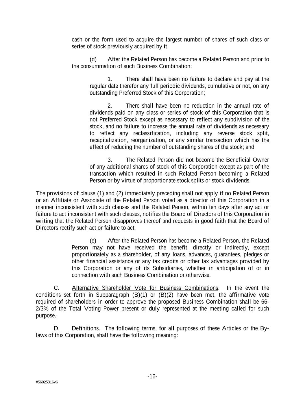 -16- #56025316v6 cash or the form used to acquire the largest number of shares of such class or series of stock previously acquired by it. (d) After the Related Person has become a Related Person and prior to the consummation of such Business Combination: 1. There shall have been no failure to declare and pay at the regular date therefor any full periodic dividends, cumulative or not, on any outstanding Preferred Stock of this Corporation; 2. There shall have been no reduction in the annual rate of dividends paid on any class or series of stock of this Corporation that is not Preferred Stock except as necessary to reflect any subdivision of the stock, and no failure to increase the annual rate of dividends as necessary to reflect any reclassification, including any reverse stock split, recapitalization, reorganization, or any similar transaction which has the effect of reducing the number of outstanding shares of the stock; and 3. The Related Person did not become the Beneficial Owner of any additional shares of stock of this Corporation except as part of the transaction which resulted in such Related Person becoming a Related Person or by virtue of proportionate stock splits or stock dividends. The provisions of clause (1) and (2) immediately preceding shall not apply if no Related Person or an Affiliate or Associate of the Related Person voted as a director of this Corporation in a manner inconsistent with such clauses and the Related Person, within ten days after any act or failure to act inconsistent with such clauses, notifies the Board of Directors of this Corporation in writing that the Related Person disapproves thereof and requests in good faith that the Board of Directors rectify such act or failure to act. (e) After the Related Person has become a Related Person, the Related Person may not have received the benefit, directly or indirectly, except proportionately as a shareholder, of any loans, advances, guarantees, pledges or other financial assistance or any tax credits or other tax advantages provided by this Corporation or any of its Subsidiaries, whether in anticipation of or in connection with such Business Combination or otherwise. C. Alternative Shareholder Vote for Business Combinations. In the event the conditions set forth in Subparagraph (B)(1) or (B)(2) have been met, the affirmative vote required of shareholders in order to approve the proposed Business Combination shall be 66- 2/3% of the Total Voting Power present or duly represented at the meeting called for such purpose. D. Definitions. The following terms, for all purposes of these Articles or the By- laws of this Corporation, shall have the following meaning: