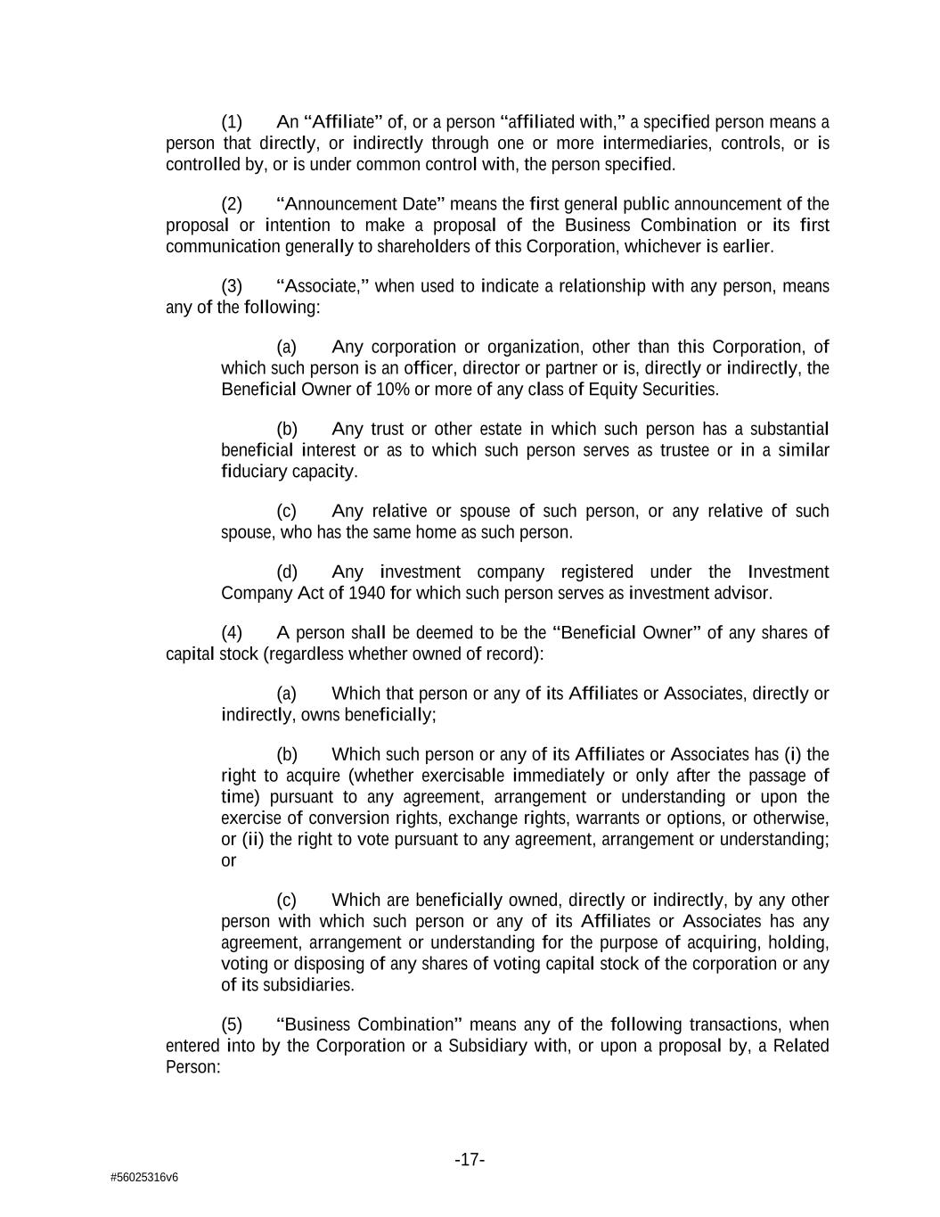 -17- #56025316v6 (1) An “Affiliate” of, or a person “affiliated with,” a specified person means a person that directly, or indirectly through one or more intermediaries, controls, or is controlled by, or is under common control with, the person specified. (2) “Announcement Date” means the first general public announcement of the proposal or intention to make a proposal of the Business Combination or its first communication generally to shareholders of this Corporation, whichever is earlier. (3) “Associate,” when used to indicate a relationship with any person, means any of the following: (a) Any corporation or organization, other than this Corporation, of which such person is an officer, director or partner or is, directly or indirectly, the Beneficial Owner of 10% or more of any class of Equity Securities. (b) Any trust or other estate in which such person has a substantial beneficial interest or as to which such person serves as trustee or in a similar fiduciary capacity. (c) Any relative or spouse of such person, or any relative of such spouse, who has the same home as such person. (d) Any investment company registered under the Investment Company Act of 1940 for which such person serves as investment advisor. (4) A person shall be deemed to be the “Beneficial Owner” of any shares of capital stock (regardless whether owned of record): (a) Which that person or any of its Affiliates or Associates, directly or indirectly, owns beneficially; (b) Which such person or any of its Affiliates or Associates has (i) the right to acquire (whether exercisable immediately or only after the passage of time) pursuant to any agreement, arrangement or understanding or upon the exercise of conversion rights, exchange rights, warrants or options, or otherwise, or (ii) the right to vote pursuant to any agreement, arrangement or understanding; or (c) Which are beneficially owned, directly or indirectly, by any other person with which such person or any of its Affiliates or Associates has any agreement, arrangement or understanding for the purpose of acquiring, holding, voting or disposing of any shares of voting capital stock of the corporation or any of its subsidiaries. (5) “Business Combination” means any of the following transactions, when entered into by the Corporation or a Subsidiary with, or upon a proposal by, a Related Person: