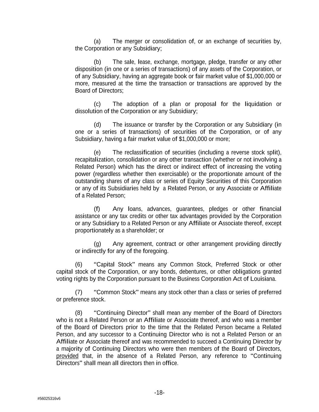 -18- #56025316v6 (a) The merger or consolidation of, or an exchange of securities by, the Corporation or any Subsidiary; (b) The sale, lease, exchange, mortgage, pledge, transfer or any other disposition (in one or a series of transactions) of any assets of the Corporation, or of any Subsidiary, having an aggregate book or fair market value of $1,000,000 or more, measured at the time the transaction or transactions are approved by the Board of Directors; (c) The adoption of a plan or proposal for the liquidation or dissolution of the Corporation or any Subsidiary; (d) The issuance or transfer by the Corporation or any Subsidiary (in one or a series of transactions) of securities of the Corporation, or of any Subsidiary, having a fair market value of $1,000,000 or more; (e) The reclassification of securities (including a reverse stock split), recapitalization, consolidation or any other transaction (whether or not involving a Related Person) which has the direct or indirect effect of increasing the voting power (regardless whether then exercisable) or the proportionate amount of the outstanding shares of any class or series of Equity Securities of this Corporation or any of its Subsidiaries held by a Related Person, or any Associate or Affiliate of a Related Person; (f) Any loans, advances, guarantees, pledges or other financial assistance or any tax credits or other tax advantages provided by the Corporation or any Subsidiary to a Related Person or any Affiliate or Associate thereof, except proportionately as a shareholder; or (g) Any agreement, contract or other arrangement providing directly or indirectly for any of the foregoing. (6) “Capital Stock” means any Common Stock, Preferred Stock or other capital stock of the Corporation, or any bonds, debentures, or other obligations granted voting rights by the Corporation pursuant to the Business Corporation Act of Louisiana. (7) “Common Stock” means any stock other than a class or series of preferred or preference stock. (8) “Continuing Director” shall mean any member of the Board of Directors who is not a Related Person or an Affiliate or Associate thereof, and who was a member of the Board of Directors prior to the time that the Related Person became a Related Person, and any successor to a Continuing Director who is not a Related Person or an Affiliate or Associate thereof and was recommended to succeed a Continuing Director by a majority of Continuing Directors who were then members of the Board of Directors, provided that, in the absence of a Related Person, any reference to “Continuing Directors” shall mean all directors then in office.