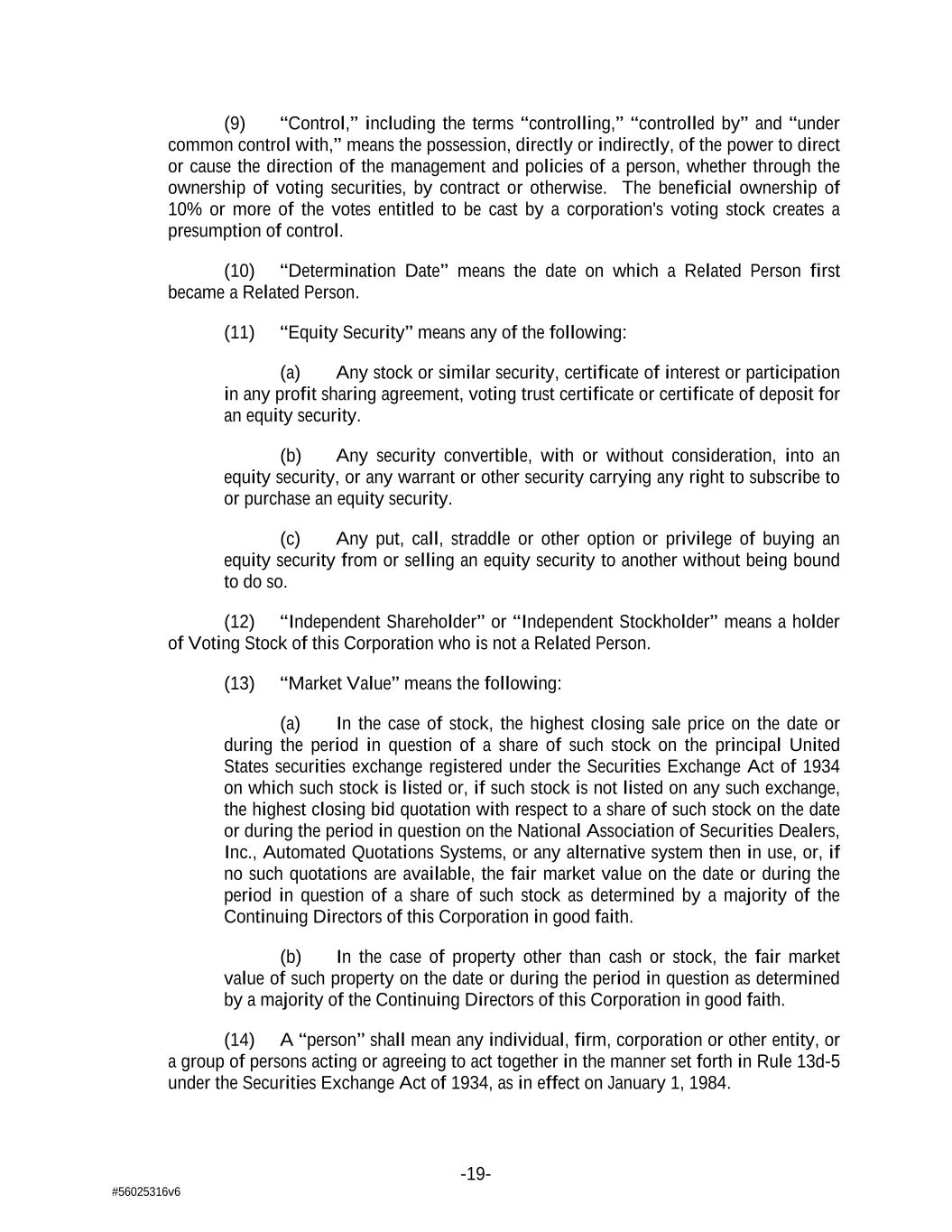 -19- #56025316v6 (9) “Control,” including the terms “controlling,” “controlled by” and “under common control with,” means the possession, directly or indirectly, of the power to direct or cause the direction of the management and policies of a person, whether through the ownership of voting securities, by contract or otherwise. The beneficial ownership of 10% or more of the votes entitled to be cast by a corporation's voting stock creates a presumption of control. (10) “Determination Date” means the date on which a Related Person first became a Related Person. (11) “Equity Security” means any of the following: (a) Any stock or similar security, certificate of interest or participation in any profit sharing agreement, voting trust certificate or certificate of deposit for an equity security. (b) Any security convertible, with or without consideration, into an equity security, or any warrant or other security carrying any right to subscribe to or purchase an equity security. (c) Any put, call, straddle or other option or privilege of buying an equity security from or selling an equity security to another without being bound to do so. (12) “Independent Shareholder” or “Independent Stockholder” means a holder of Voting Stock of this Corporation who is not a Related Person. (13) “Market Value” means the following: (a) In the case of stock, the highest closing sale price on the date or during the period in question of a share of such stock on the principal United States securities exchange registered under the Securities Exchange Act of 1934 on which such stock is listed or, if such stock is not listed on any such exchange, the highest closing bid quotation with respect to a share of such stock on the date or during the period in question on the National Association of Securities Dealers, Inc., Automated Quotations Systems, or any alternative system then in use, or, if no such quotations are available, the fair market value on the date or during the period in question of a share of such stock as determined by a majority of the Continuing Directors of this Corporation in good faith. (b) In the case of property other than cash or stock, the fair market value of such property on the date or during the period in question as determined by a majority of the Continuing Directors of this Corporation in good faith. (14) A “person” shall mean any individual, firm, corporation or other entity, or a group of persons acting or agreeing to act together in the manner set forth in Rule 13d-5 under the Securities Exchange Act of 1934, as in effect on January 1, 1984.