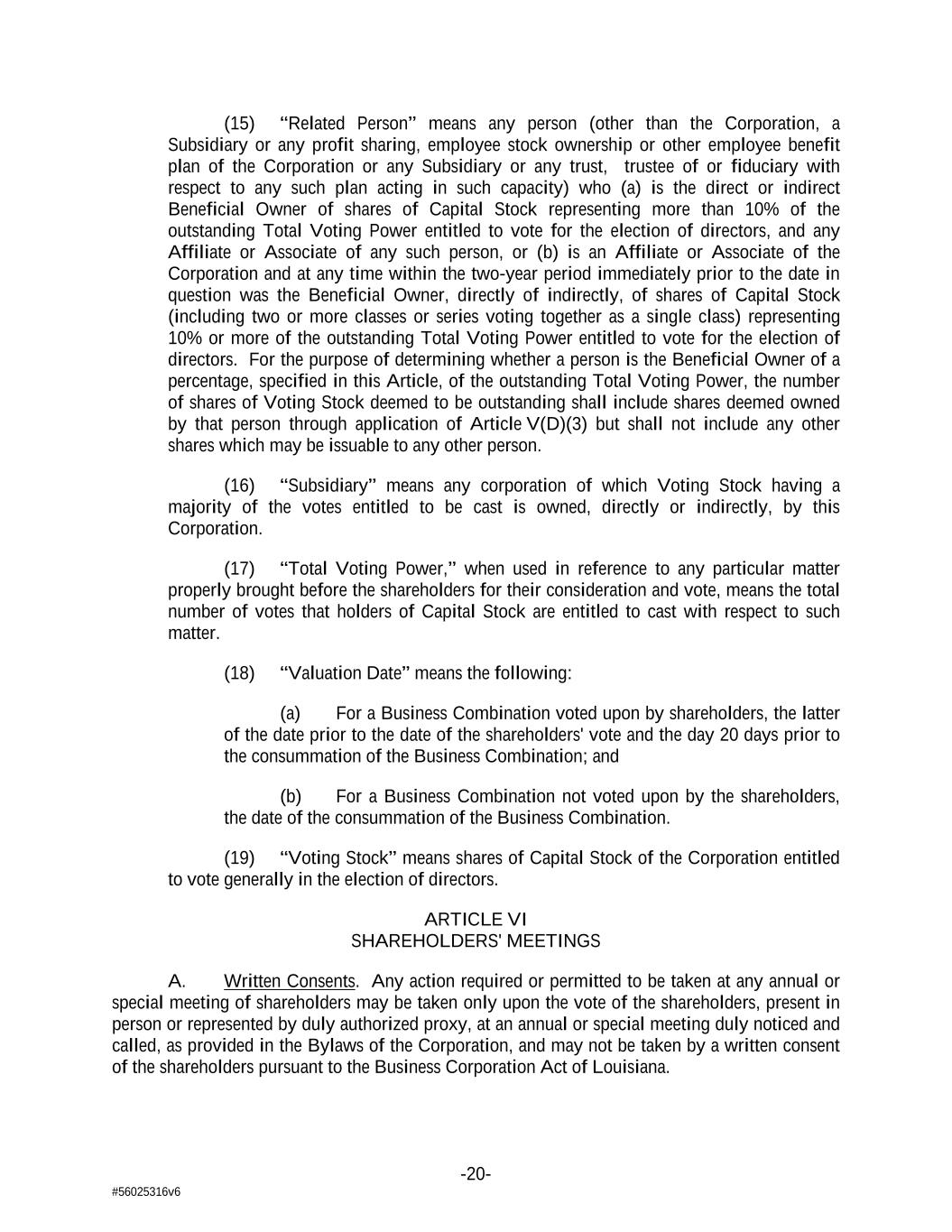 -20- #56025316v6 (15) “Related Person” means any person (other than the Corporation, a Subsidiary or any profit sharing, employee stock ownership or other employee benefit plan of the Corporation or any Subsidiary or any trust, trustee of or fiduciary with respect to any such plan acting in such capacity) who (a) is the direct or indirect Beneficial Owner of shares of Capital Stock representing more than 10% of the outstanding Total Voting Power entitled to vote for the election of directors, and any Affiliate or Associate of any such person, or (b) is an Affiliate or Associate of the Corporation and at any time within the two-year period immediately prior to the date in question was the Beneficial Owner, directly of indirectly, of shares of Capital Stock (including two or more classes or series voting together as a single class) representing 10% or more of the outstanding Total Voting Power entitled to vote for the election of directors. For the purpose of determining whether a person is the Beneficial Owner of a percentage, specified in this Article, of the outstanding Total Voting Power, the number of shares of Voting Stock deemed to be outstanding shall include shares deemed owned by that person through application of Article V(D)(3) but shall not include any other shares which may be issuable to any other person. (16) “Subsidiary” means any corporation of which Voting Stock having a majority of the votes entitled to be cast is owned, directly or indirectly, by this Corporation. (17) “Total Voting Power,” when used in reference to any particular matter properly brought before the shareholders for their consideration and vote, means the total number of votes that holders of Capital Stock are entitled to cast with respect to such matter. (18) “Valuation Date” means the following: (a) For a Business Combination voted upon by shareholders, the latter of the date prior to the date of the shareholders' vote and the day 20 days prior to the consummation of the Business Combination; and (b) For a Business Combination not voted upon by the shareholders, the date of the consummation of the Business Combination. (19) “Voting Stock” means shares of Capital Stock of the Corporation entitled to vote generally in the election of directors. ARTICLE VI SHAREHOLDERS' MEETINGS A. Written Consents. Any action required or permitted to be taken at any annual or special meeting of shareholders may be taken only upon the vote of the shareholders, present in person or represented by duly authorized proxy, at an annual or special meeting duly noticed and called, as provided in the Bylaws of the Corporation, and may not be taken by a written consent of the shareholders pursuant to the Business Corporation Act of Louisiana.