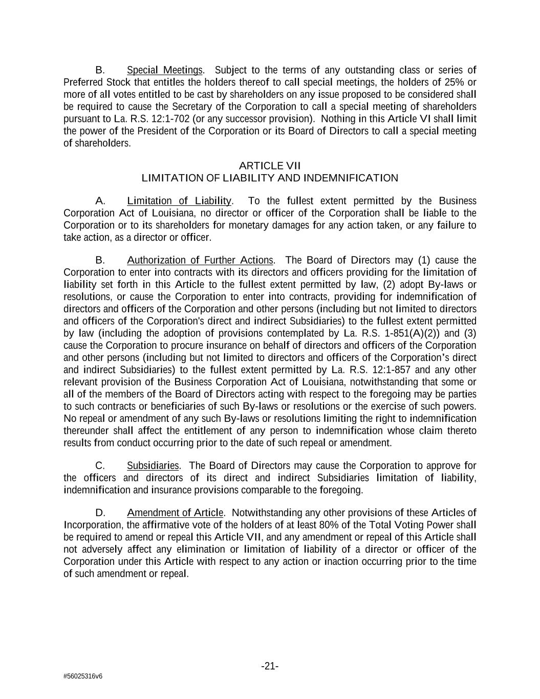 -21- #56025316v6 B. Special Meetings. Subject to the terms of any outstanding class or series of Preferred Stock that entitles the holders thereof to call special meetings, the holders of 25% or more of all votes entitled to be cast by shareholders on any issue proposed to be considered shall be required to cause the Secretary of the Corporation to call a special meeting of shareholders pursuant to La. R.S. 12:1-702 (or any successor provision). Nothing in this Article VI shall limit the power of the President of the Corporation or its Board of Directors to call a special meeting of shareholders. ARTICLE VII LIMITATION OF LIABILITY AND INDEMNIFICATION A. Limitation of Liability. To the fullest extent permitted by the Business Corporation Act of Louisiana, no director or officer of the Corporation shall be liable to the Corporation or to its shareholders for monetary damages for any action taken, or any failure to take action, as a director or officer. B. Authorization of Further Actions. The Board of Directors may (1) cause the Corporation to enter into contracts with its directors and officers providing for the limitation of liability set forth in this Article to the fullest extent permitted by law, (2) adopt By-laws or resolutions, or cause the Corporation to enter into contracts, providing for indemnification of directors and officers of the Corporation and other persons (including but not limited to directors and officers of the Corporation's direct and indirect Subsidiaries) to the fullest extent permitted by law (including the adoption of provisions contemplated by La. R.S. 1-851(A)(2)) and (3) cause the Corporation to procure insurance on behalf of directors and officers of the Corporation and other persons (including but not limited to directors and officers of the Corporation’s direct and indirect Subsidiaries) to the fullest extent permitted by La. R.S. 12:1-857 and any other relevant provision of the Business Corporation Act of Louisiana, notwithstanding that some or all of the members of the Board of Directors acting with respect to the foregoing may be parties to such contracts or beneficiaries of such By-laws or resolutions or the exercise of such powers. No repeal or amendment of any such By-laws or resolutions limiting the right to indemnification thereunder shall affect the entitlement of any person to indemnification whose claim thereto results from conduct occurring prior to the date of such repeal or amendment. C. Subsidiaries. The Board of Directors may cause the Corporation to approve for the officers and directors of its direct and indirect Subsidiaries limitation of liability, indemnification and insurance provisions comparable to the foregoing. D. Amendment of Article. Notwithstanding any other provisions of these Articles of Incorporation, the affirmative vote of the holders of at least 80% of the Total Voting Power shall be required to amend or repeal this Article VII, and any amendment or repeal of this Article shall not adversely affect any elimination or limitation of liability of a director or officer of the Corporation under this Article with respect to any action or inaction occurring prior to the time of such amendment or repeal.
