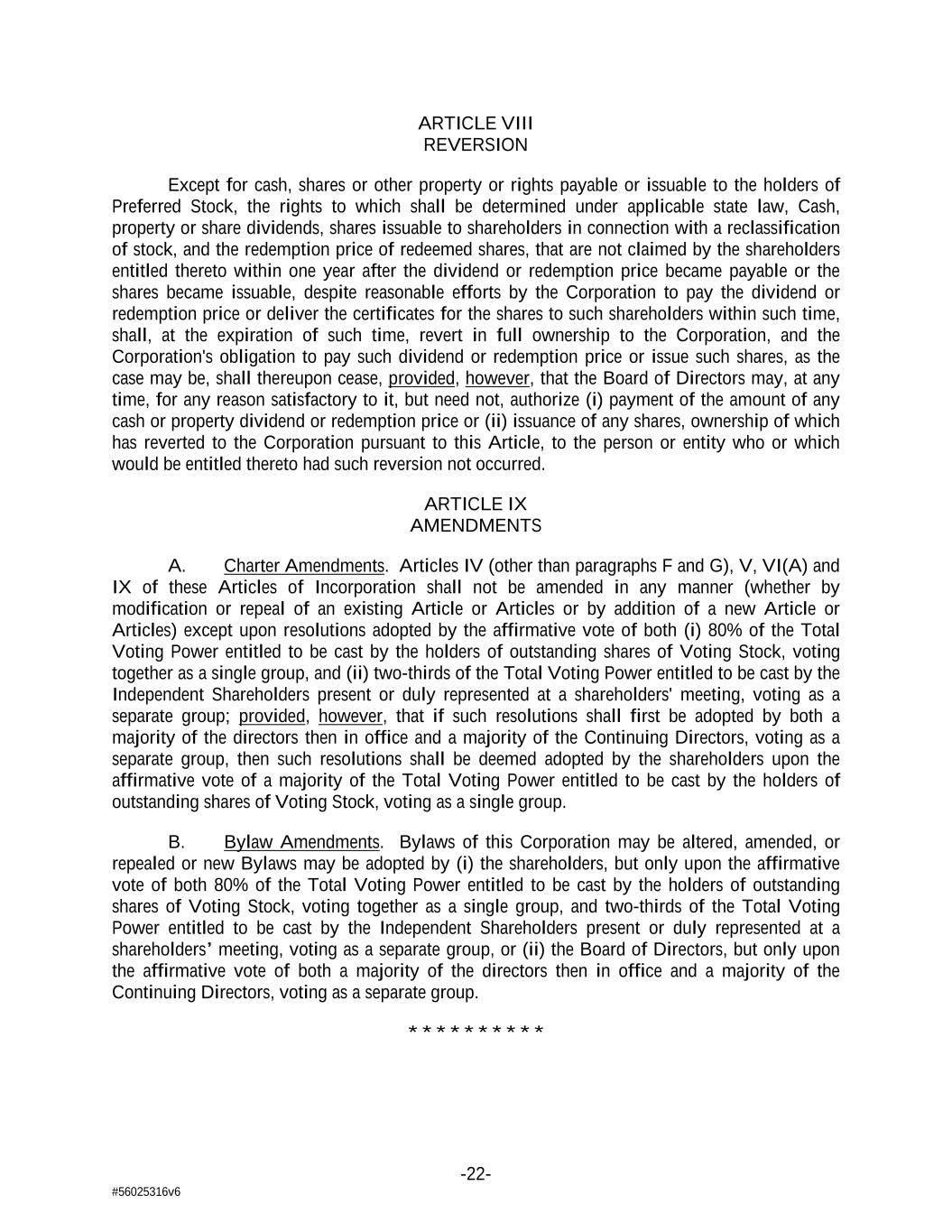 -22- #56025316v6 ARTICLE VIII REVERSION Except for cash, shares or other property or rights payable or issuable to the holders of Preferred Stock, the rights to which shall be determined under applicable state law, Cash, property or share dividends, shares issuable to shareholders in connection with a reclassification of stock, and the redemption price of redeemed shares, that are not claimed by the shareholders entitled thereto within one year after the dividend or redemption price became payable or the shares became issuable, despite reasonable efforts by the Corporation to pay the dividend or redemption price or deliver the certificates for the shares to such shareholders within such time, shall, at the expiration of such time, revert in full ownership to the Corporation, and the Corporation's obligation to pay such dividend or redemption price or issue such shares, as the case may be, shall thereupon cease, provided, however, that the Board of Directors may, at any time, for any reason satisfactory to it, but need not, authorize (i) payment of the amount of any cash or property dividend or redemption price or (ii) issuance of any shares, ownership of which has reverted to the Corporation pursuant to this Article, to the person or entity who or which would be entitled thereto had such reversion not occurred. ARTICLE IX AMENDMENTS A. Charter Amendments. Articles IV (other than paragraphs F and G), V, VI(A) and IX of these Articles of Incorporation shall not be amended in any manner (whether by modification or repeal of an existing Article or Articles or by addition of a new Article or Articles) except upon resolutions adopted by the affirmative vote of both (i) 80% of the Total Voting Power entitled to be cast by the holders of outstanding shares of Voting Stock, voting together as a single group, and (ii) two-thirds of the Total Voting Power entitled to be cast by the Independent Shareholders present or duly represented at a shareholders' meeting, voting as a separate group; provided, however, that if such resolutions shall first be adopted by both a majority of the directors then in office and a majority of the Continuing Directors, voting as a separate group, then such resolutions shall be deemed adopted by the shareholders upon the affirmative vote of a majority of the Total Voting Power entitled to be cast by the holders of outstanding shares of Voting Stock, voting as a single group. B. Bylaw Amendments. Bylaws of this Corporation may be altered, amended, or repealed or new Bylaws may be adopted by (i) the shareholders, but only upon the affirmative vote of both 80% of the Total Voting Power entitled to be cast by the holders of outstanding shares of Voting Stock, voting together as a single group, and two-thirds of the Total Voting Power entitled to be cast by the Independent Shareholders present or duly represented at a shareholders’ meeting, voting as a separate group, or (ii) the Board of Directors, but only upon the affirmative vote of both a majority of the directors then in office and a majority of the Continuing Directors, voting as a separate group. * * * * * * * * * *