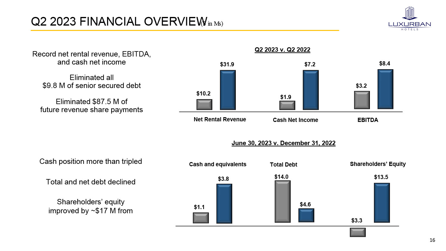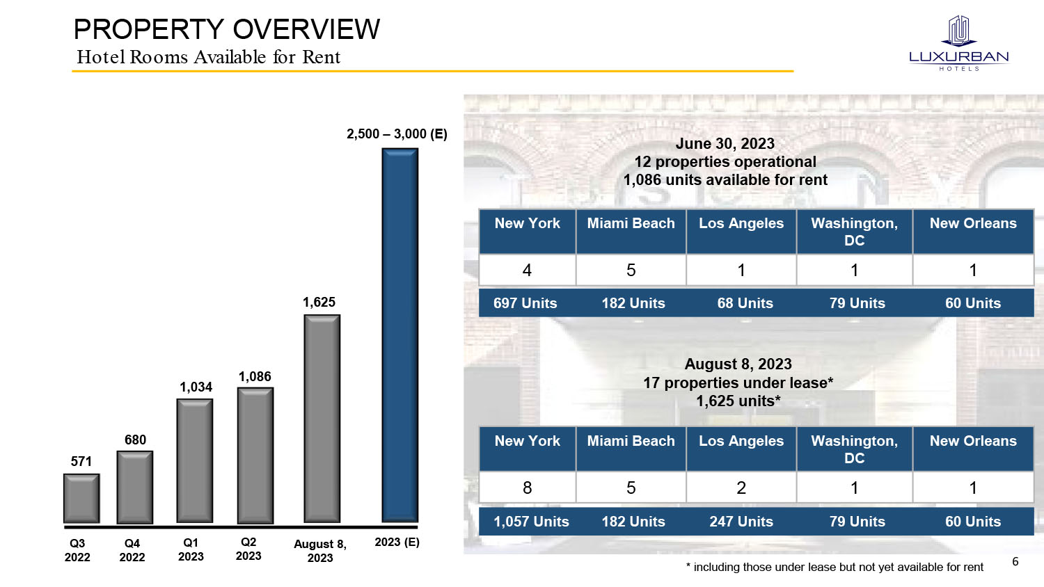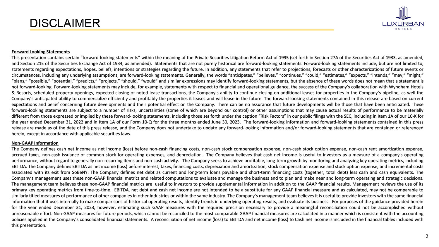 2 DISCLAIMER Forward Looking Statements This presentation contains certain “forward - looking statements” within the meaning of the Private Securities Litigation Reform Act of 1995 (set forth in Section 27 A of the Securities Act of 1933 , as amended, and Section 21 E of the Securities Exchange Act of 1934 , as amended) . Statements that are not purely historical are forward - looking statements . Forward - looking statements include, but are not limited to, statements regarding expectations, hopes, beliefs, intentions or strategies regarding the future . In addition, any statements that refer to projections, forecasts or other characterizations of future events or circumstances, including any underlying assumptions, are forward - looking statements . Generally, the words “anticipates,” “believes,” “continues,” “could,” “estimates,” “expects,” “intends,” “may,” “might,” “plans,” “possible,” “potential,” “predicts,” “projects,” “should,” “would” and similar expressions may identify forward - looking statements, but the absence of these words does not mean that a statement is not forward - looking . Forward - looking statements may include, for example, statements with respect to financial and operational guidance, the success of the Company’s collaboration with Wyndham Hotels & Resorts, scheduled property openings, expected closing of noted lease transactions, the Company’s ability to continue closing on additional leases for properties in the Company’s pipeline, as well the Company’s anticipated ability to commercialize efficiently and profitably the properties it leases and will lease in the future . The forward - looking statements contained in this release are based on current expectations and belief concerning future developments and their potential effect on the Company . There can be no assurance that future developments will be those that have been anticipated . These forward - looking statements are subject to a number of risks, uncertainties (some of which are beyond our control) or other assumptions that may cause actual results of performance to be materially different from those expressed or implied by these forward - looking statements, including those set forth under the caption “Risk Factors” in our public filings with the SEC, including in Item 1 A of our 10 - K for the year ended December 31 , 2022 and in Item 1 A of our Form 10 - Q for the three months ended June 30 , 2023 . The forward - looking information and forward - looking statements contained in this press release are made as of the date of this press release, and the Company does not undertake to update any forward - looking information and/or forward - looking statements that are contained or referenced herein, except in accordance with applicable securities laws . Non - GAAP Information The Company defines cash net income as net income (loss) before non - cash financing costs, non - cash stock compensation expense, non - cash stock option expense, non - cash rent amortization expense, accrued taxes, non - cash issuance of common stock for operating expenses, and depreciation . The Company believes that cash net income is useful to investors as a measure of a company's operating performance, without regard to generally non - recurring items and non - cash activity . The Company seeks to achieve profitable, long - term growth by monitoring and analyzing key operating metrics, including EBITDA . The Company defines EBITDA as net income (loss) before interest, taxes, financing costs, depreciation and amortization, stock compensation expense and stock option expense, and incremental costs associated with its exit from SoBeNY . The Company defines net debt as current and long - term loans payable and short - term financing costs (together, total debt) less cash and cash equivalents . The Company’s management uses these non - GAAP financial metrics and related computations to evaluate and manage the business and to plan and make near and long - term operating and strategic decisions . The management team believes these non - GAAP financial metrics are useful to investors to provide supplemental information in addition to the GAAP financial results . Management reviews the use of its primary key operating metrics from time - to - time . EBITDA, net debt and cash net income are not intended to be a substitute for any GAAP financial measure and as calculated, may not be comparable to similarly titled measures of performance of other companies in other industries or within the same industry . The Company’s management team believes it is useful to provide investors with the same financial information that it uses internally to make comparisons of historical operating results, identify trends in underlying operating results, and evaluate its business . For purposes of the guidance provided herein for the year ended December 31 , 2023 , however, estimating such GAAP measures with the required precision necessary to provide a meaningful reconciliation could not be accomplished without unreasonable effort . Non - GAAP measures for future periods, which cannot be reconciled to the most comparable GAAP financial measures are calculated in a manner which is consistent with the accounting policies applied in the Company’s consolidated financial statements . A reconciliation of net income (loss) to EBITDA and net income (loss) to Cash net income is included in the financial tables included with this presentation .