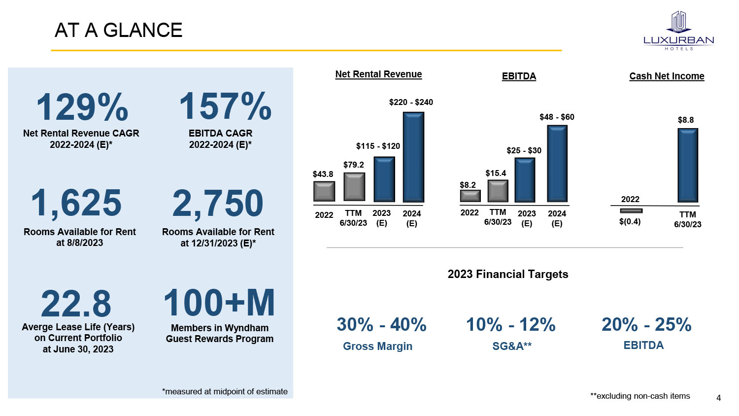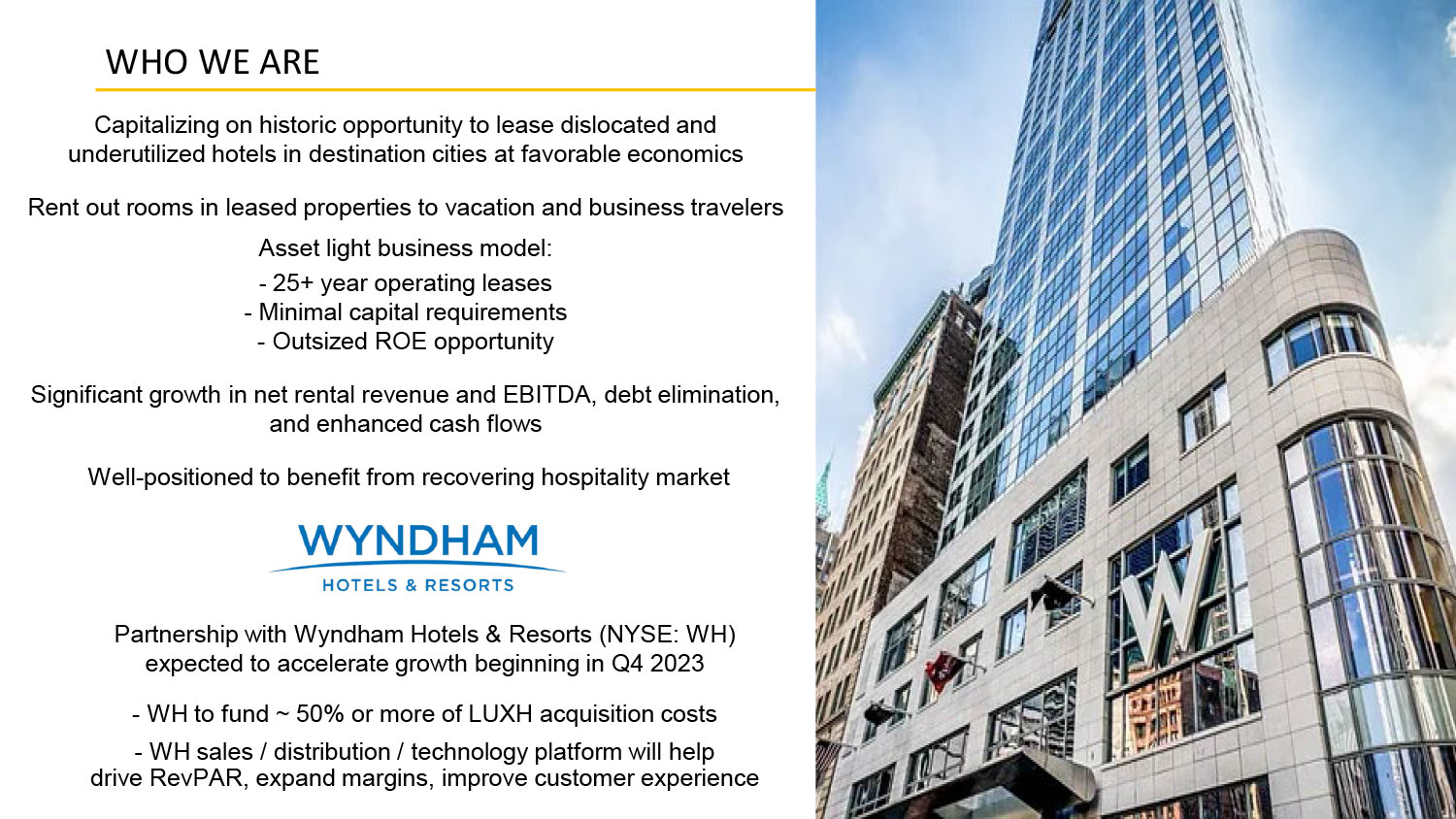 3 Capitalizing on historic opportunity to lease dislocated and underutilized hotels in destination cities at favorable economics Rent out rooms in leased properties to vacation and business travelers Asset light business model: - 25+ year operating leases - Minimal capital requirements - Outsized ROE opportunity Significant growth in net rental revenue and EBITDA, debt elimination, and enhanced cash flows Well - positioned to benefit from recovering hospitality market Partnership with Wyndham Hotels & Resorts (NYSE: WH) expected to accelerate growth beginning in Q4 2023 - WH to fund ~ 50% or more of LUXH acquisition costs - WH sales / distribution / technology platform will help drive RevPAR, expand margins, improve customer experience WHO WE ARE