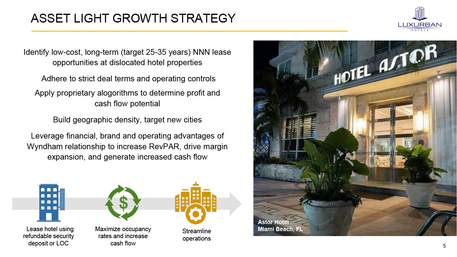 4 AT A GLANCE SERVICE Net Rental Revenue $79.2 $115 - $120 $220 - $240 TTM 6/30/23 2023 (E) 2024 (E) $43.8 2022 $15.4 $25 - $30 $48 - $60 TTM 6/30/23 2023 (E) 2024 (E) $8.2 2022 EBITDA $8.8 TTM 6/30/23 $(0.4) 2022 Cash Net Income Net Rental Revenue CAGR 2022 - 2024 (E)* EBITDA CAGR 2022 - 2024 (E)* Averge Lease Life (Years) on Current Portfolio at June 30, 2023 Members in Wyndham Guest Rewards Program Rooms Available for Rent at 12/31/2023 (E)* 129% 157% 100+M 2,750 22.8 2023 Financial Targets Gross Margin SG&A** EBITDA 30% - 40% 10% - 12% 20% - 25% *measured at midpoint of estimate **excluding non - cash items Rooms Available for Rent at 8/8/2023 1,625