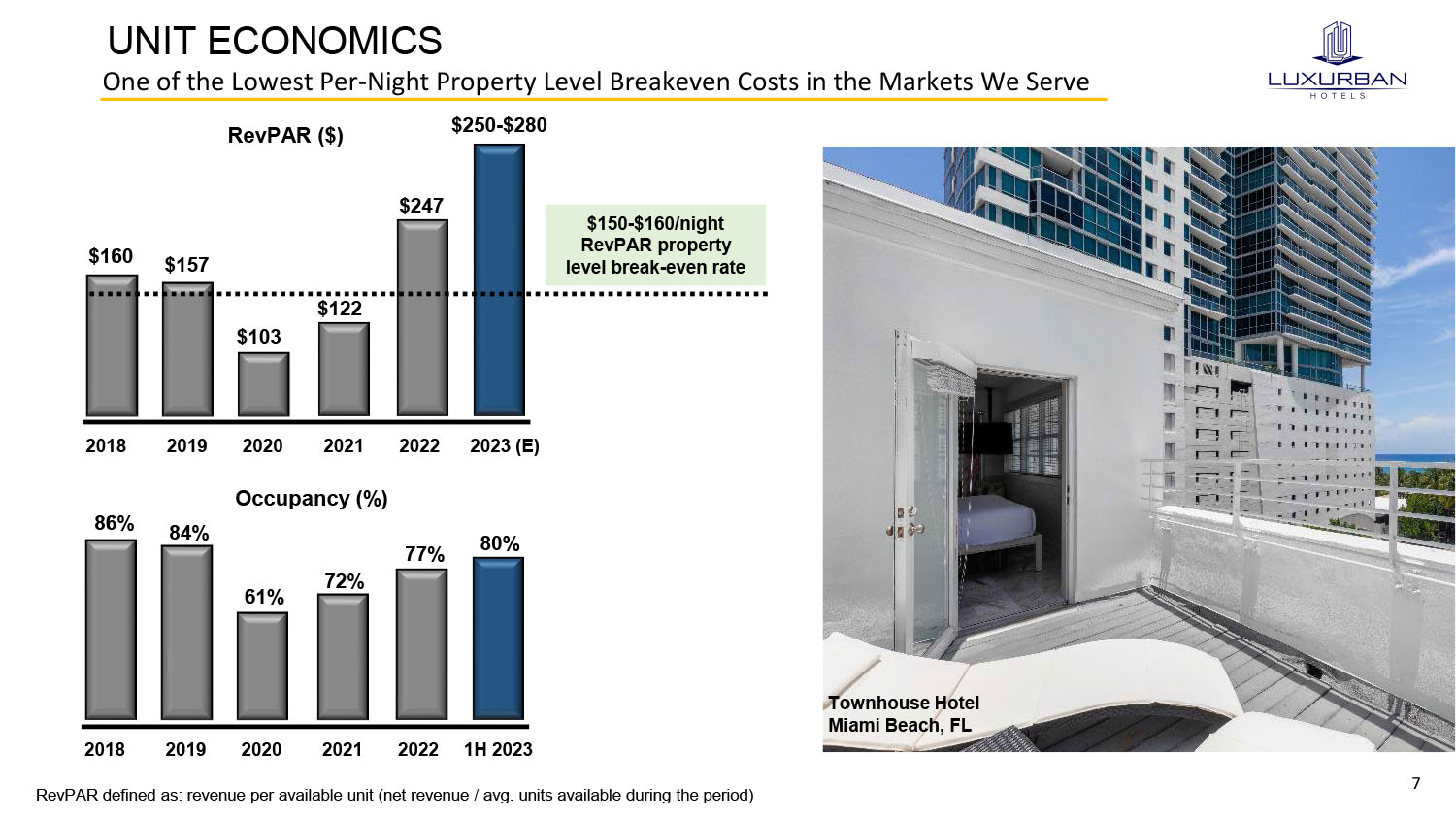 6 PROPERTY OVERVIEW Hotel Rooms Available for Rent SERVICE 571 680 1,034 August 8, 2023 1,086 1,625 Q3 2022 Q4 2022 Q1 2023 Q2 2023 2023 (E) 2,500 – 3,000 (E) New York Miami Beach Los Angeles Washington, DC New Orleans 4 5 1 1 1 June 30, 2023 1 2 properties operational 1,086 units available for rent August 8, 2023 17 properties under lease* 1,625 units* New York Miami Beach Los Angeles Washington, DC New Orleans 8 5 2 1 1 697 Units 182 Units 68 Units 79 Units 60 Units 1,057 Units 182 Units 247 Units 79 Units 60 Units * including those under lease but not yet available for rent