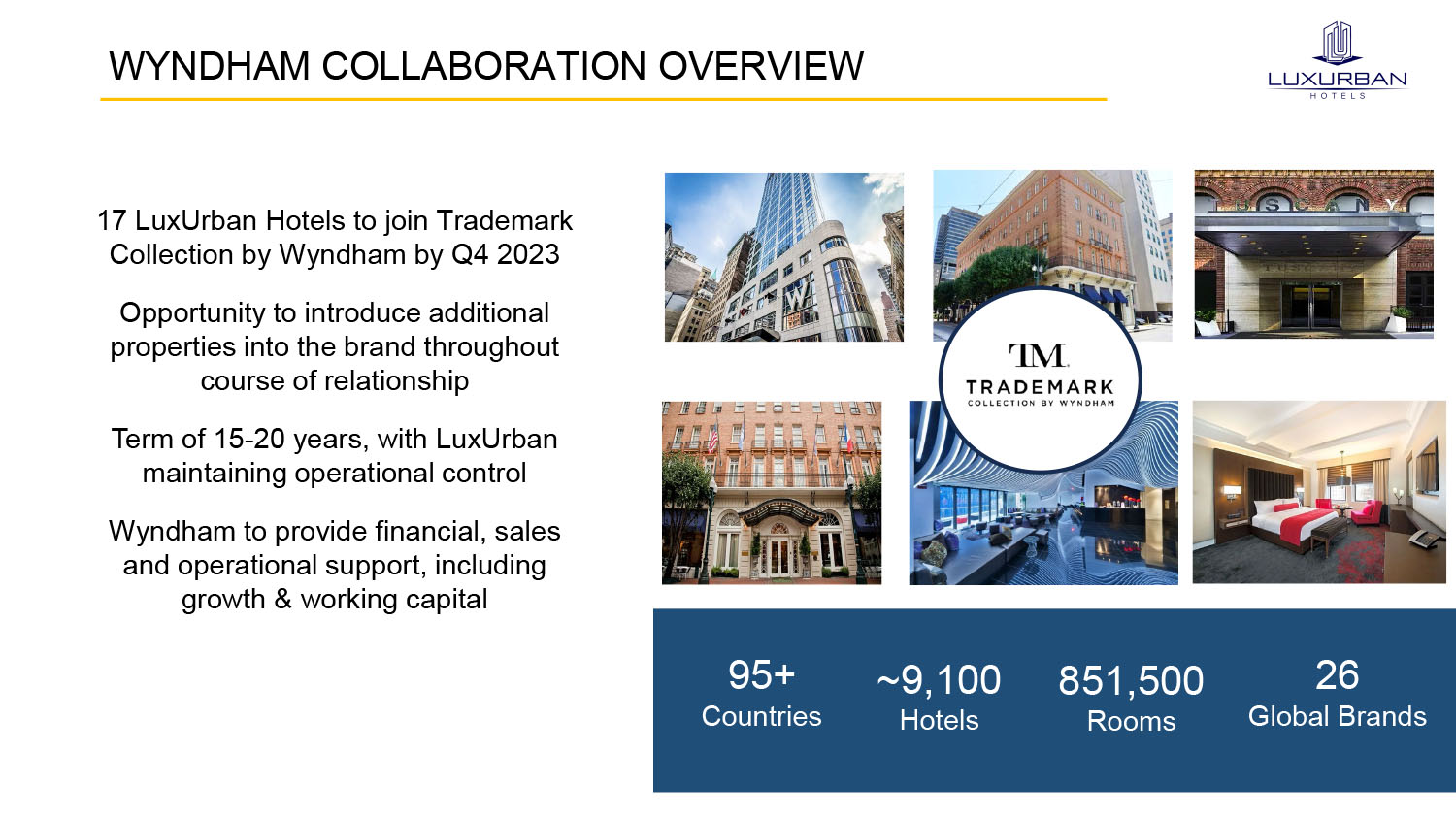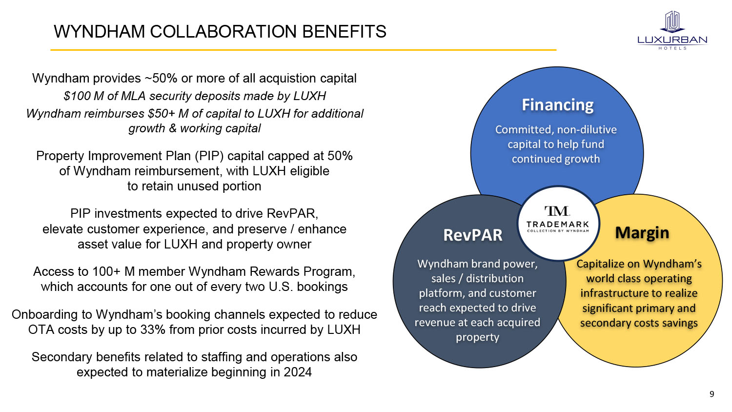 8 WYNDHAM COLLABORATION OVERVIEW 95+ Countries ~9,100 Hotels 26 Global Brands 851,500 Rooms 17 LuxUrban Hotels to join Trademark Collection by Wyndham by Q4 2023 Opportunity to introduce additi o nal properties into the brand throughout course of relationship Term of 15 - 20 years, with LuxUrban maintaining operational control Wyndham to provide financial, sales and operational support, including growth & working capital