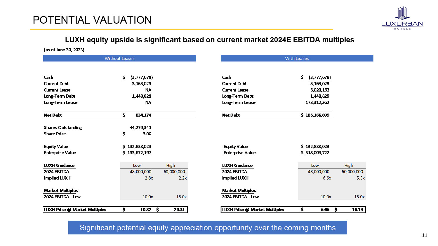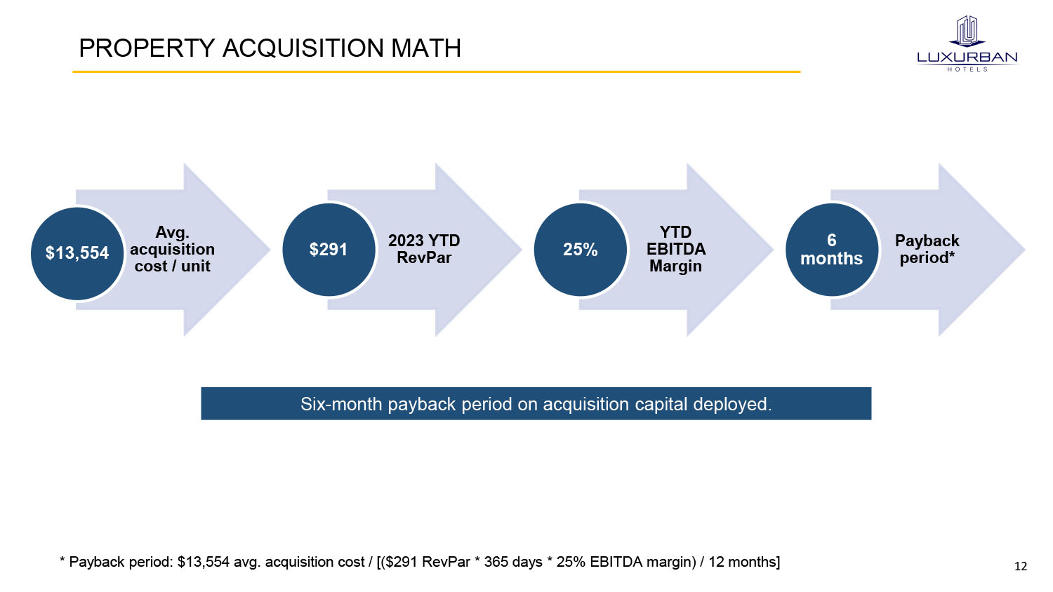 11 POTENTIAL VALUATION LUXH equity upside is significant based on current market 2024E EBITDA multiples (as of June 30, 2023) Cash (3,777,678)$ Cash (3,777,678)$ Current Debt 3,163,023 Current Debt 3,163,023 Current Lease NA Current Lease 6,020,163 Long-Term Debt 1,448,829 Long-Term Debt 1,448,829 Long-Term Lease NA Long-Term Lease 178,312,362 Net Debt 834,174$ Net Debt 185,166,699$ Shares Outstanding 44,279,341 Share Price 3.00$ Equity Value 132,838,023$ Equity Value 132,838,023$ Enterprise Value 133,672,197$ Enterprise Value 318,004,722$ LUXH Guidance Low High LUXH Guidance Low High 2024 EBITDA 48,000,000 60,000,000 2024 EBITDA 48,000,000 60,000,000 Implied LUXH 2.8x 2.2x Implied LUXH 6.6x 5.3x Market Multiples Market Multiples 2024 EBITDA - Low 10.0x 15.0x 2024 EBITDA - Low 10.0x 15.0x LUXH Price @ Market Multiples 10.82$ 20.31$ LUXH Price @ Market Multiples 6.66$ 16.14$ Without Leases With Leases Significant potential equity appreciation opportunity over the coming months