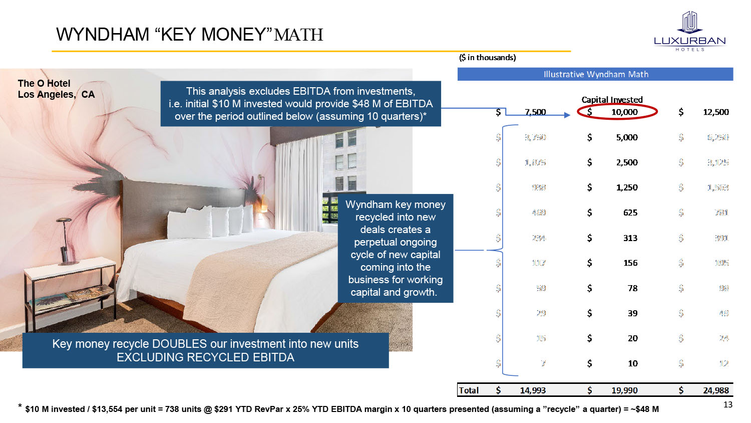 13 WYNDHAM “KEY MONEY” MATH ($ in thousands) Capital Invested 7,500$ 10,000$ 12,500$ 3,750$ 5,000$ 6,250$ 1,875$ 2,500$ 3,125$ 938$ 1,250$ 1,563$ 469$ 625$ 781$ 234$ 313$ 391$ 117$ 156$ 195$ 59$ 78$ 98$ 29$ 39$ 49$ 15$ 20$ 24$ 7$ 10$ 12$ Total 14,993$ 19,990$ 24,988$ Illustrative Wyndham Math The O Hotel Los Angeles, CA This analysis excludes EBITDA from investments, i.e. initial $10 M invested would provide $48 M of EBITDA over the period outlined below (assuming 10 quarters)* Wyndham key money recycled into new deals creates a perpetual ongoing cycle of new capital coming into the business for working capital and growth. * $10 M invested / $13,554 per unit = 738 units @ $291 YTD RevPar x 25% YTD EBITDA margin x 10 quarters presented (assuming a ”recycle” a quarter) = ~$48 M Key money recycle DOUBLES our investment into new units EXCLUDING RECYCLED EBITDA