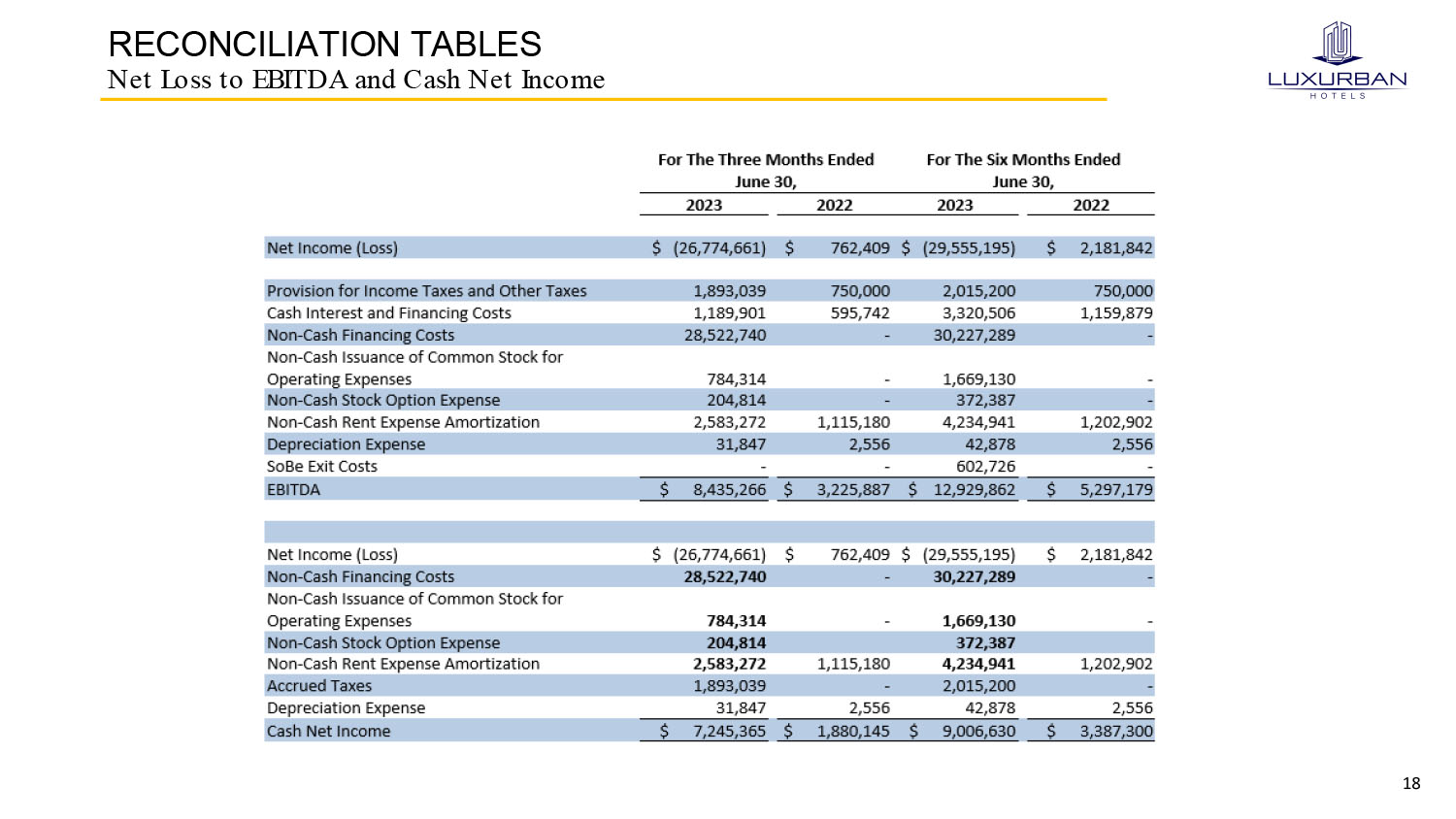 18 RECONCILIATION TABLES Net Loss to EBITDA and Cash Net Income