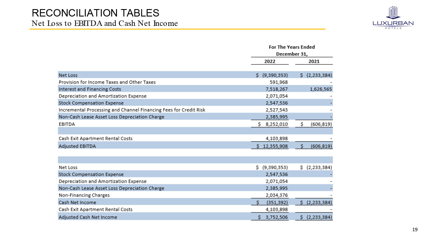 19 RECONCILIATION TABLES Net Loss to EBITDA and Cash Net Income