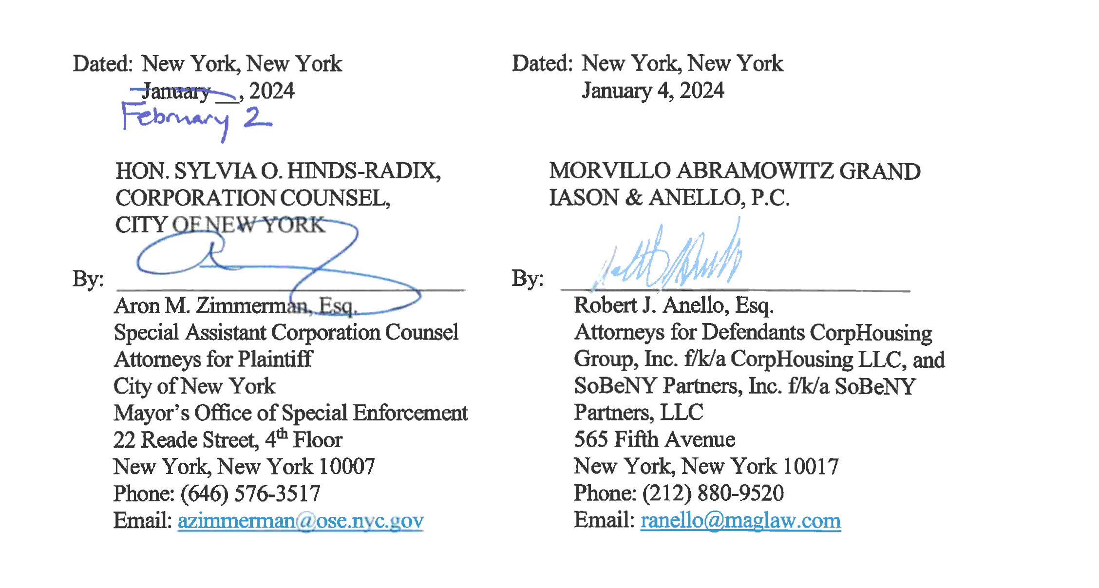 Dated: New York, New York Dated: New York, New York danm_, 2024 January 4, 2024 Swy 2-- HON. SYLVIA O. HINDS-RADIX, MORVILLO ABRAMOWITZ GRAND CORPORATION COUNSEL, IASON & ANELLO, P.C. CITY E Aron M. Zinunerm Robert J. Anello, Esq. Special Assistant Corporation Counsel Attorneys for Defendants CorpHousing Attorneys for Plaintiff Group, Inc. f/k/a CorpHousing LLC, and City of New York SoBeNY Partners, Inc. f/k/a SoBeNY Mayor's Office of Special Enforcement Partners, LLC 22 Reade Street, 46 Floor 565 Fifth Avenue New York, New York 10007 New York, New York 10017 Phone: (646) 576-3517 Phone: (212) 880-9520 Email: azimmerman(a ose.nve.gov Email: ranelloCalmaglaw.com