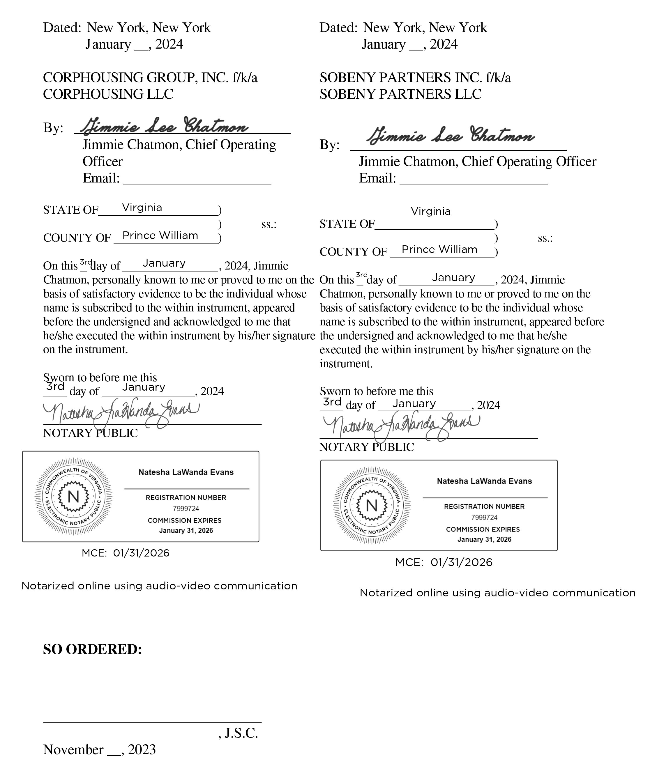 Dated: New York, New York January __, 2024 CORPHOUSING GROUP, INC. f/k/a CORPHOUSING LLC By: _______________________________ Jimmie Chatmon, Chief Operating Officer Email: _____________________ STATE OF ) ) ss.: COUNTY OF ) On this day of , 2024, Jimmie Chatmon, personally known to me or proved to me on the basis of satisfactory evidence to be the individual whose name is subscribed to the within instrument, appeared before the undersigned and acknowledged to me that he/she executed the within instrument by his/her signature on the instrument. Sworn to before me this ____ day of ________________, 2024 NOTARY PUBLIC Dated: New York, New York January __, 2024 SOBENY PARTNERS INC. f/k/a SOBENY PARTNERS LLC By: _______________________________ Jimmie Chatmon, Chief Operating Officer Email: _____________________ STATE OF ) ) ss.: COUNTY OF ) On this day of , 2024, Jimmie Chatmon, personally known to me or proved to me on the basis of satisfactory evidence to be the individual whose name is subscribed to the within instrument, appeared before the undersigned and acknowledged to me that he/she executed the within instrument by his/her signature on the instrument. Sworn to before me this ____ day of ________________, 2024 NOTARY PUBLIC SO ORDERED: , J.S.C. November __, 2023 Virginia Virginia Prince William Prince William 3rd January 3rd January 3rd January 3rd January Notarized online using audio-video communication Notarized online using audio-video communication MCE: 01/31/2026 MCE: 01/31/2026