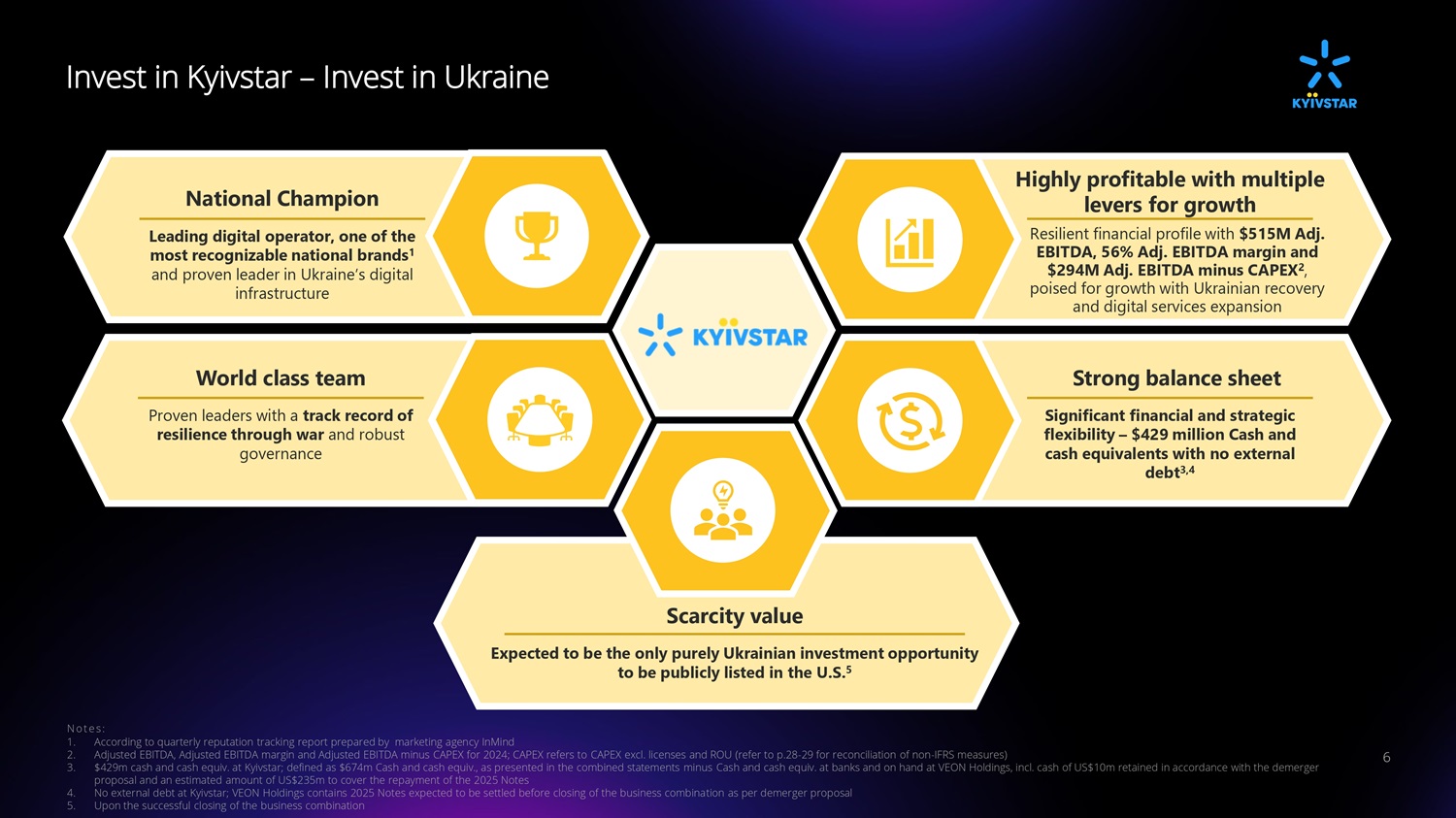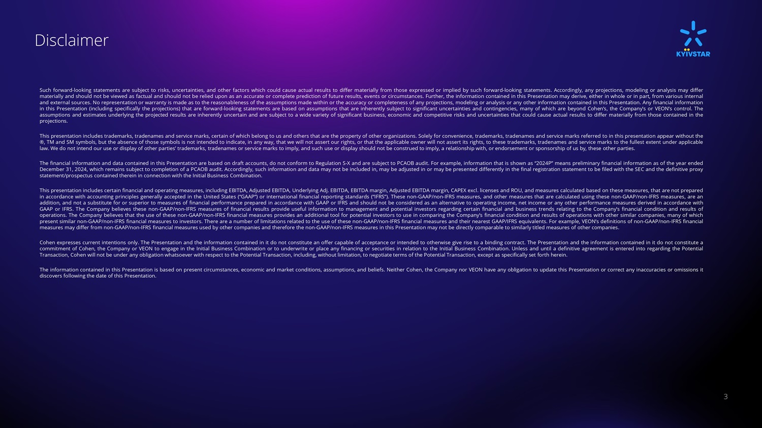 Disclaimer 2 This presentation (the “Presentation”) has been prepared by Cohen Circle Acquisition Corp . I ( “Cohen,” “us” or “we”) and is provided on a confidential basis solely to the recipients that are “accredited investors” (as defined in Rule 506 of Regulation D) (any such recipient, together with its subsidiaries and affiliates, the “Recipient”) solely for their own benefit and internal use for purposes of considering an opportunity to participate in the proposed private placement (the “Potential Transaction”) in connection with the potential initial business combination (the “Initial Business Combination”) of Cohen with PJSC Kyivstar and its subsidiaries (the “Target” or the “Company”), a subsidiary of VEON Ltd . (“VEON”) . Any reproduction or distribution of this Presentation, in whole or in part, or the disclosure of its contents, without Cohen’s prior written consent, is prohibited . This disclaimer and the requirement for strict confidentiality shall apply without prejudice to any other confidentiality obligations to which you are subject . By accepting this Presentation, you hereby agree to be bound by and comply with the restrictions contained herein . By accepting and/or by reading this Presentation, the Recipient agrees and undertakes towards Cohen, the Company and VEON that it will not, and will cause its directors, officers, employees, representatives, advisors and consultants (the “Representatives”) not to disclose any type of information relating to Cohen the Company or VEON . By accepting this Presentation, the Recipient agrees to maintain this information in the strictest confidence and to protect and safeguard this Presentation against any unauthorized publication or disclosure . Although Cohen reasonably believes the information contained in this Presentation related to Cohen and the Company is accurate in all material respects as of the date of this Presentation or the date to which the information contained in this Presentation makes reference to, neither Cohen, the Company nor any of its affiliates, directors, officers, shareholders, employees or advisers or any other person, makes any representation or warranty, either expressed or implied, as to the accuracy, completeness or reliability of the information contained herein or any other written, oral or other communications transmitted or otherwise made available to the Recipient in the course of its evaluation of the Potential Transaction . Cohen, the Company and VEON further expressly disclaim any and all liability relating to or resulting from the use of this Presentation based on the accuracy or sufficiency thereof or on any errors, omissions or misstatements, negligent or otherwise, relating thereto . Accordingly, none of Cohen, the Company, VEON nor any of its affiliates, directors, officers, shareholders, employees or advisers or any other person shall be liable for any direct, indirect or consequential loss or damages suffered or incurred by any Recipient as a result of relying on any statement in or omission from this Presentation, and the Recipient hereby expressly disclaims such liability . In addition, the information contained in this Presentation is provided as of the date hereof and may change, and neither Cohen, the Company nor VEON undertakes any obligation to update such information, including in the event that such information becomes inaccurate or incomplete . Except to the extent required by law, neither Cohen, the Company, VEON nor any other person assumes responsibility for the accuracy or completeness of the information contained in this Presentation . Further, the information contained herein is preliminary, based on a range of assumptions, is provided for discussion purposes only, is only a summary of selected key information, is not complete, does not take into account all relevant economic and market factors, does not contain certain material information about the Potential Transaction, including risk factors associated with Cohen, the Company or the Potential Transaction, and is subject to change without notice . This Presentation is not intended to contain all the information that a person may desire in considering the Potential Transaction . Prior to entering into the Potential Transaction, a person should consult with its own advisors (including but not limited to legal, regulatory, tax, business, financial and accounting advisors) to the extent necessary, and make its own investment decision and perform its own independent investigation and analysis of the Potential Transaction . The Recipient should not consider any information in this Presentation to be legal, investment, business, tax or accounting advice or a recommendation . The Recipient agrees that none of Rothschild & Co . (“Rothschild”), Cohen, the Company, VEON or any of their respective affiliates, directors, officers, employees, shareholders, advisors or agents shall have any liability for any misstatement or omission of fact or any opinion expressed herein . Any person consulting this Presentation should also carefully consider the risks and uncertainties described in the “Risk Factors” section of Cohen’s final prospectus dated October 11 , 2024 relating to its initial public offering, and subsequent periodic filings with the U . S . Securities and Exchange Commission (the "SEC") on Form 10 - Q and Form 10 - K . Any actual terms of the opportunity may vary from what is discussed herein and may do so in a material manner . There can be no assurance, and neither Cohen, the Company nor VEON gives any assurance, that Cohen or the Company will achieve the desired results or that any investor will receive any return of or on capital . This Presentation shall neither constitute an offer to sell or the solicitation of an offer to buy any securities, nor shall there be any sale of securities in any jurisdiction in which the offer, solicitation or sale would be unlaw