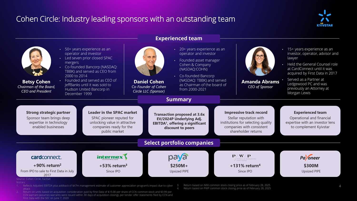 4 Cohen Circle: Industry leading sponsors with an outstanding team N o te s : 1. Reflects Adjusted EBITDA plus addback of $47m management estimate of customer appreciation program’s impact due to cyber attack 2. Return on units based on acquisition consideration paid by First Data of $15.00 per share of CCN common stock and $3.99 per CCN warrant (assumes warrants were issued within 30 days of acquisition closing), per tender offer statements filed by CCN and First Data with the SEC on June 7, 2020 3. Return based on IMXI common stock closing price as of February 28, 2025 4. Return based on PWP common stock closing price as of February 28, 2025 Select portfolio companies +90% return 2 From IPO to sale to First Data in July 2017 Source: Cohen Circle, FactSet +53% return 3 Since IPO $250M+ Upsized PIPE +131% return 4 Since IPO $300M Upsized PIPE Experienced team • 50+ years experience as an operator and investor • Led seven prior closed SPAC mergers • Co - founded Bancorp (NASDAQ: TBBK) and served as CEO from 2000 to 2014 • Founded and served as CEO of JeffBanks until it was sold to Hudson United Bancorp in December 1999 Betsy Cohen Chairman of the Board, CEO and President • 20+ years experience as an operator and investor • Founded asset manager Cohen & Company (NASDAQ:COHN) • Co - founded Bancorp (NASDAQ: TBBK) and served as Chairman of the board of from 2000 - 2021 Summary • 15+ years experience as an investor, operator, advisor and lawyer • Held the General Counsel role at CardConnect until it was acquired by First Data in 2017 • Served as a Partner at Ledgewood PC and was previously an Attorney at Morgan Lewis Daniel Cohen Co - Founder of Cohen Circle LLC (Sponsor) Amanda Abrams CEO of Sponsor Strong strategic partner Sponsor team brings deep expertise in technology enabled businesses Leader in the SPAC market SPAC pioneer reputed for unlocking value in attractive companies ready for the public market Experienced team Operational and financial expertise with an investor lens to complement Kyivstar Impressive track record Stellar reputation with institutions for selecting quality companies with consistent shareholder returns Transaction proposed at 3.6x EV/2024P Underlying Adj. EBITDA 1 , offering a significant discount to peers