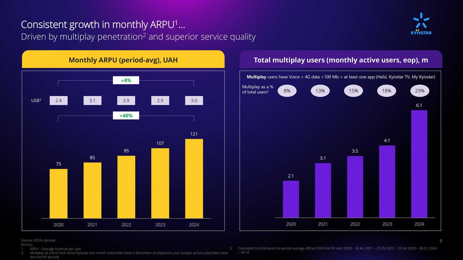 Why do we win? Technological leadership and complementary product offerings reinforce Kyivstar’s market leadership 2024 : Agreement with Starlink to introduce ground - breaking direct - to - cell satellite connectivity in Ukraine Continued focus and investment in network quality KPI 2024 Kyivstar recent network initiatives Complementary portfolio of B2B and B2C products and services Mobile (domestic, roaming, data) Fixed broadband + “Superpowers“ (Kyivstar TV, voice/data, roaming, social media, VOD offerings) 2 + High value offerings to our subscribers across a variety of bundles 1 2 2024 : Spectrum frequencies acquisition (2x5 MHz in 2100 MHz and 40 MHz in 2300 MHz band) at auction Source: VEON, Kyivstar N o te s : 1. PoPs – Points of presence (unique physical location where RAN network equipment placed) 2. Services Kyivstar subscribers can select free of charge based on their paid plans LTE population coverage # mobile PoPs 1 # fixed line subscribers 96% 15.5k 1.1m 8 STARLINK STARLINK