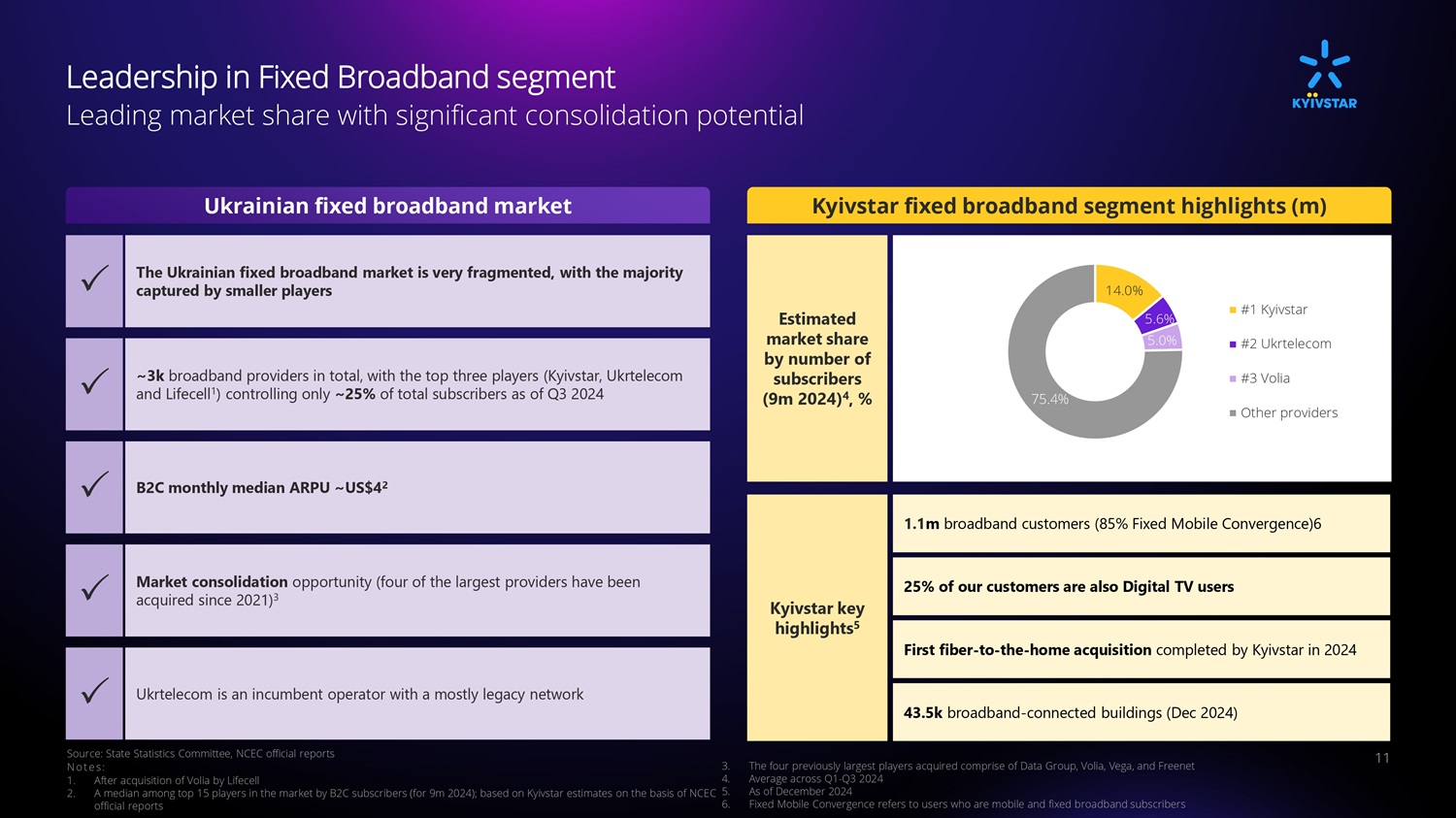 Source: GSMA, IMF N o te s : 1. Estimated as average of Q1 - Q3 2024 monthly ARPU across all MNOs in selected countries as per GSMA (in US$) 2. 2024 International Monetary Fund (IMF) estimate, per IMF October 2024 WEO database 3. Represents Kyivstar - identified potential opportunity for Kyivstar ARPU to catch up with European average monthly ARPU alongside growth in the Ukrainian economy and mobile market 14.8 13.9 13.2 12.6 12.0 12.0 11.0 10.9 10.6 10.1 8.8 6.0 3.2 3.0 Slovenia Hungary Croatia Latvia Estonia Czechia Bulgaria Lithuania Poland Romania Moldova Ukraine Axis Title Slovakia Axis Title Serbia 3% 5% 3% 3% 5% 5% 2021 2023 2025F 2026F 2027F 2024F Axis Tit e …with substantial growth potential on the back of Ukraine’s economic recovery 10 Monthly ARPU benchmarking (9m 2024) – Central and Eastern European countries vs. Kyivstar 1 10.7 Average (excl. Ukraine) 3.6x 3 Ukraine’s Real GDP growth (y - o - y) 2 , % (29%) 2022 5.5 33.4 GDP per capita, US$k 2 Population, m people 2 US$