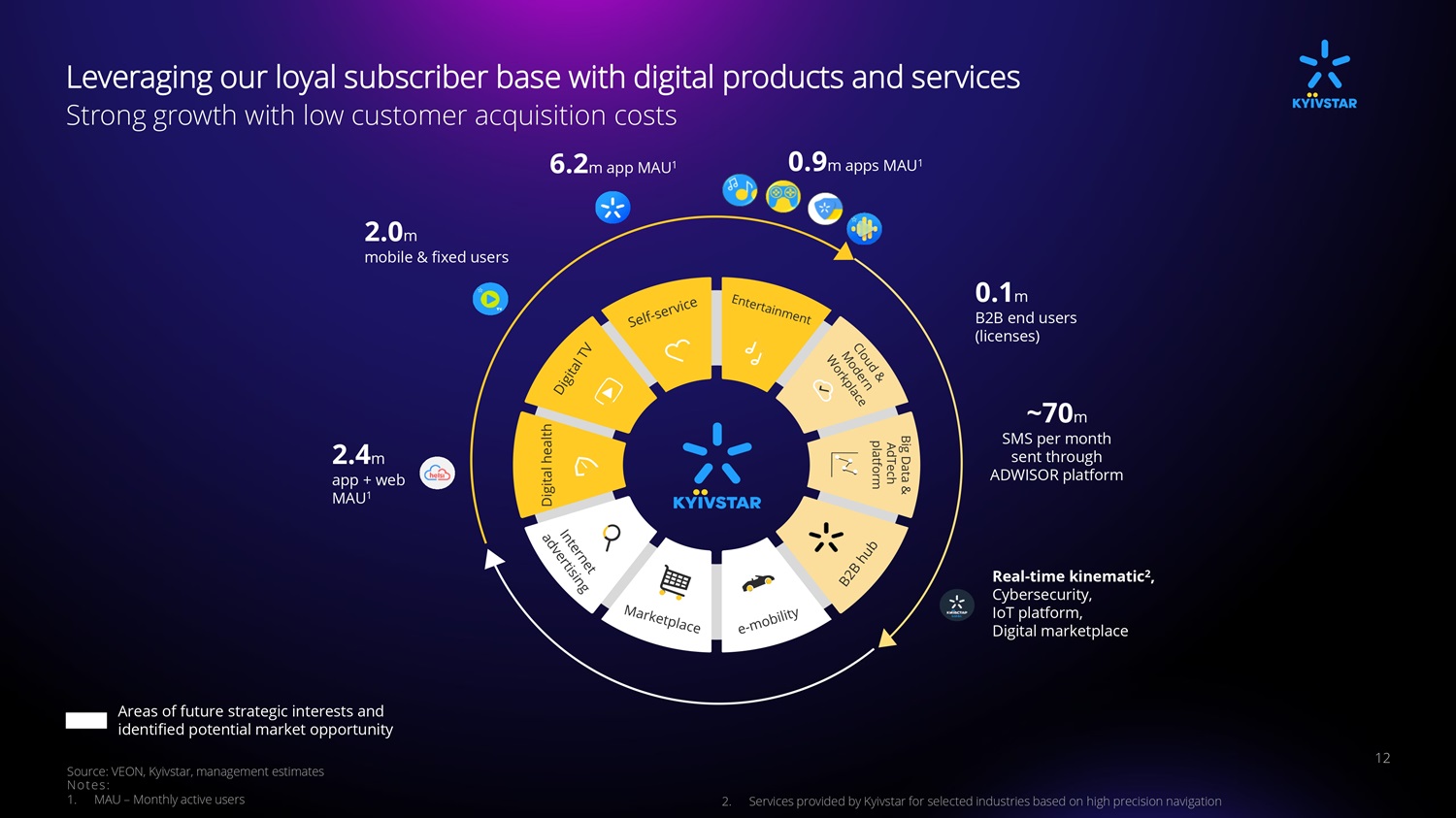 11 Source: State Statistics Committee, NCEC official reports N o te s : 1. After acquisition of Volia by Lifecell official reports 2. A median among top 15 players in the market by B2C subscribers (for 9m 2024); based on Kyivstar estimates on the basis of NCEC 5. 3. The four previously largest players acquired comprise of Data Group, Volia, Vega, and Freenet 4. Average across Q1 - Q3 2024 As of December 2024 6. Fixed Mobile Convergence refers to users who are mobile and fixed broadband subscribers Estimated market share by number of subscribers (9m 2024) 4 , % 1.1 m broadband customers (85% Fixed Mobile Convergence)6 Kyivstar key highlights 5 25% of our customers are also Digital TV users First fiber - to - the - home acquisition completed by Kyivstar in 2024 43.5k broadband - connected buildings (Dec 2024) The Ukrainian fixed broadband market is very fragmented, with the majority captured by smaller players ᴣ Leadership in Fixed Broadband segment Leading market share with significant consolidation potential Ukrainian fixed broadband market Kyivstar fixed broadband segment highlights (m) ~3k broadband providers in total, with the top three players (Kyivstar, Ukrtelecom and Lifecell 1 ) controlling only ~25% of total subscribers as of Q3 2024 ᴣ B2C monthly median ARPU ~US$4 2 ᴣ Market consolidation opportunity (four of the largest providers have been acquired since 2021) 3 ᴣ Ukrtelecom is an incumbent operator with a mostly legacy network ᴣ 14.0% 5.6% 5.0% 75.4% #1 Kyivstar #2 Ukrtelecom #3 Volia Other providers